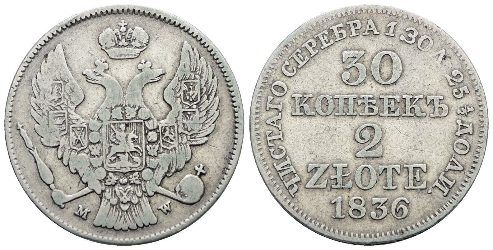 POLONIA. Nicola I (1825-1855). 2 Zlotych - 30 copechi 1836. Ag; 6,21gr; C 132; Raro; BB