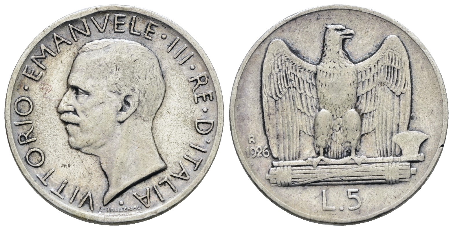 REGNO D'ITALIA. Vittorio Emanuele III (1900-1943). 5 lire 1926 "Aquilotto". Ag; 5gr; Gig.73b; Raro; MB/BB