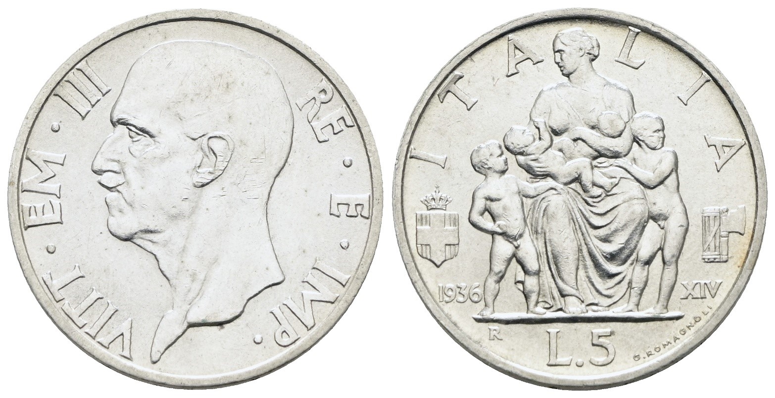 REGNO D'ITALIA. Vittorio Emanuele III (1900-1943). 5 lire 1936 "Famiglia". Ag; 5gr; Gig. 83; SPL/FDC