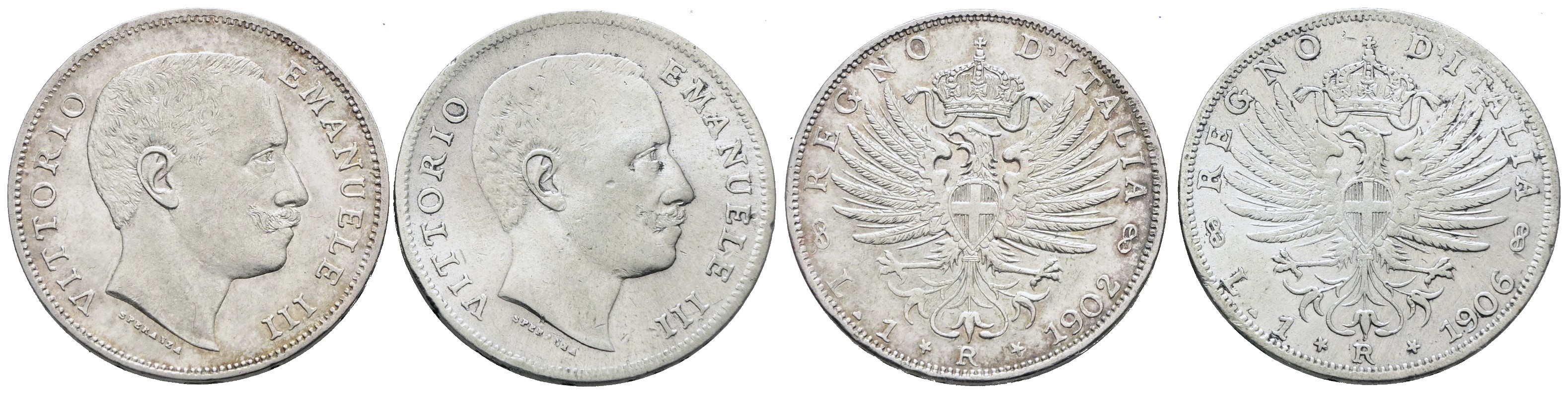 REGNO D'ITALIA. Vittorio Emanuele III (1900-1943). Lotto di 2 monete da 1 lira 1902-1906 "Aquila sabauda". Ag; Conservazioni varie