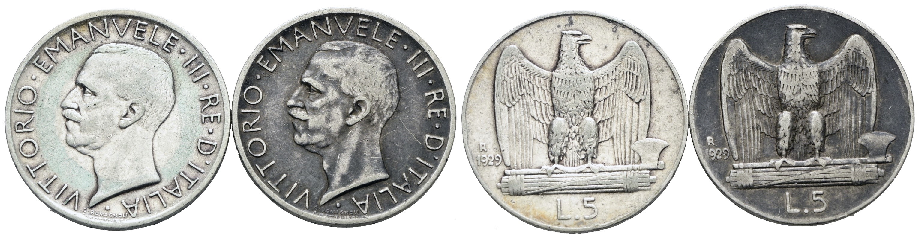 REGNO D'ITALIA. Vittorio Emanuele III (1900-1943). Lotto di 2 monete da 5 lire 1929 "Aquilotto". Ag; Conservazioni varie