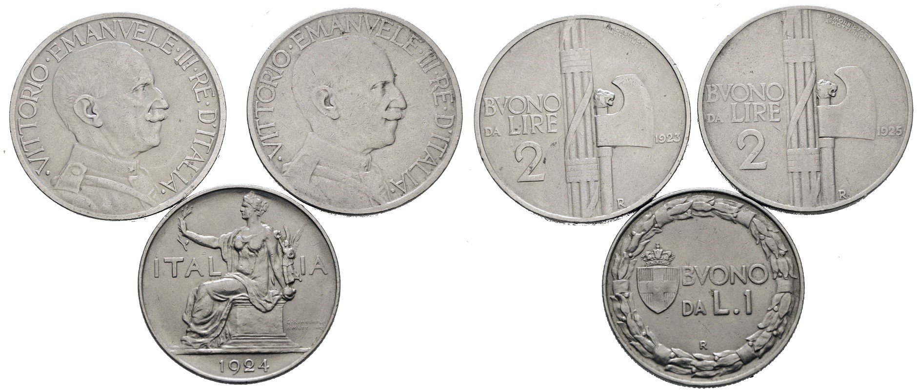 REGNO D'ITALIA. Vittorio Emanuele III (1900-1943). Lotto di 3 monete da 2 lire 1923-1925; 1 lira 1924. Ni; Conservazioni varie