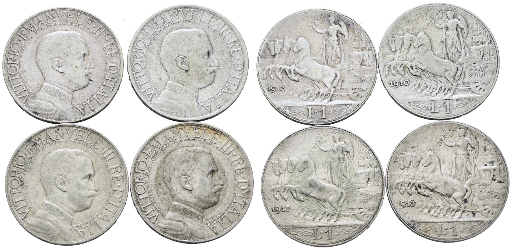 REGNO D'ITALIA. Vittorio Emanuele III (1900-1943). Lotto di 4 monete da 1 lira "Quadriga veloce". Ag; Date e conservazioni varie