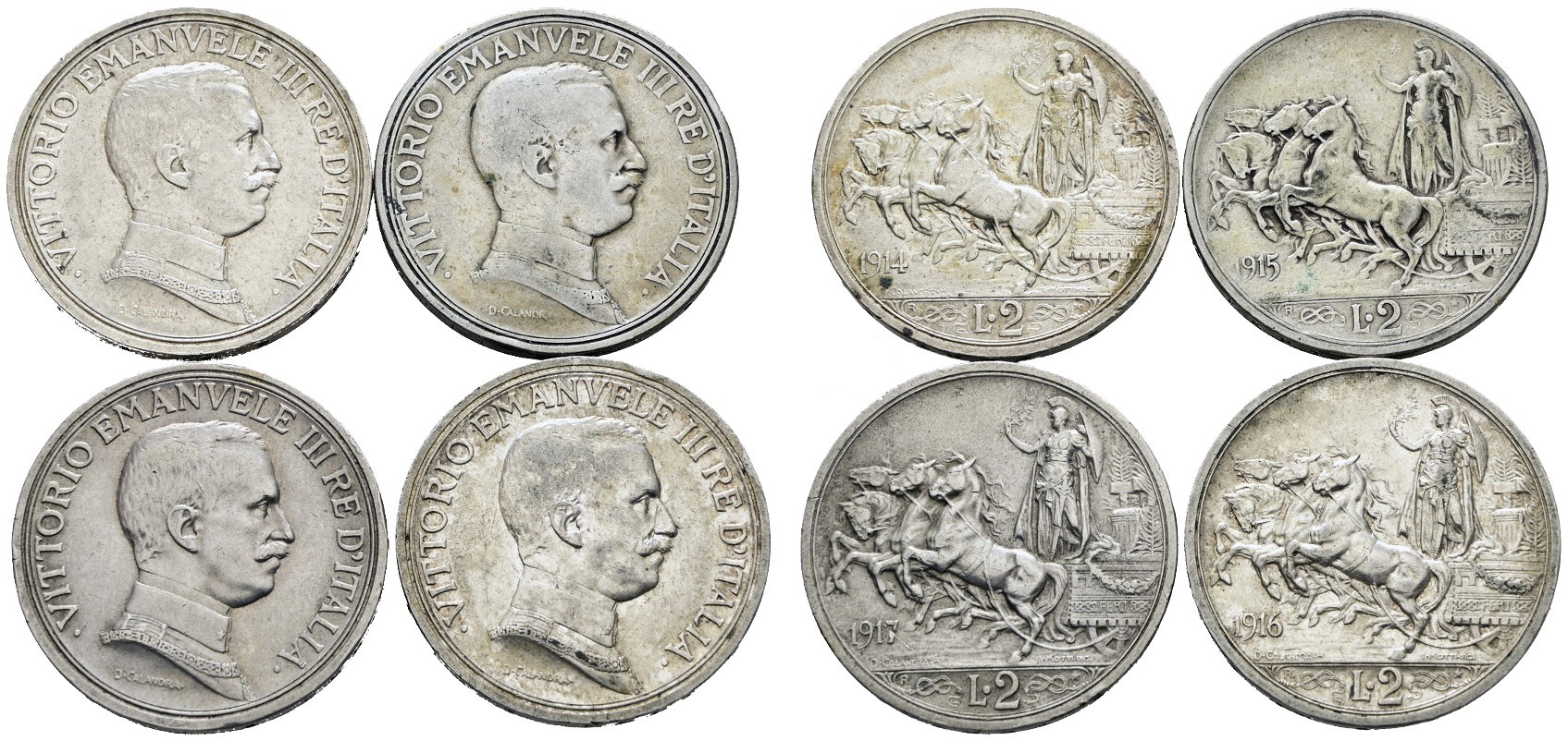 REGNO D'ITALIA. Vittorio Emanuele III (1900-1943). Lotto di 4 monete da 2 lire "Quadriga briosa" 1914, 1915, 1916, 1917. Ag; Conservazioni varie.