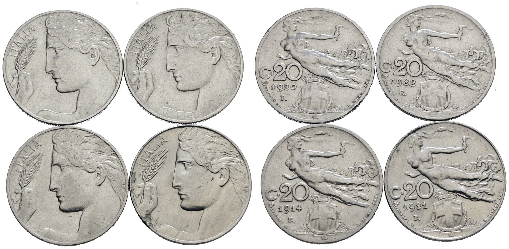 REGNO D'ITALIA. Vittorio Emanuele III (1900-1943). Lotto di 4 monete da 20 centesimi "Libertà librata". Ni; Date e conservazioni varie
