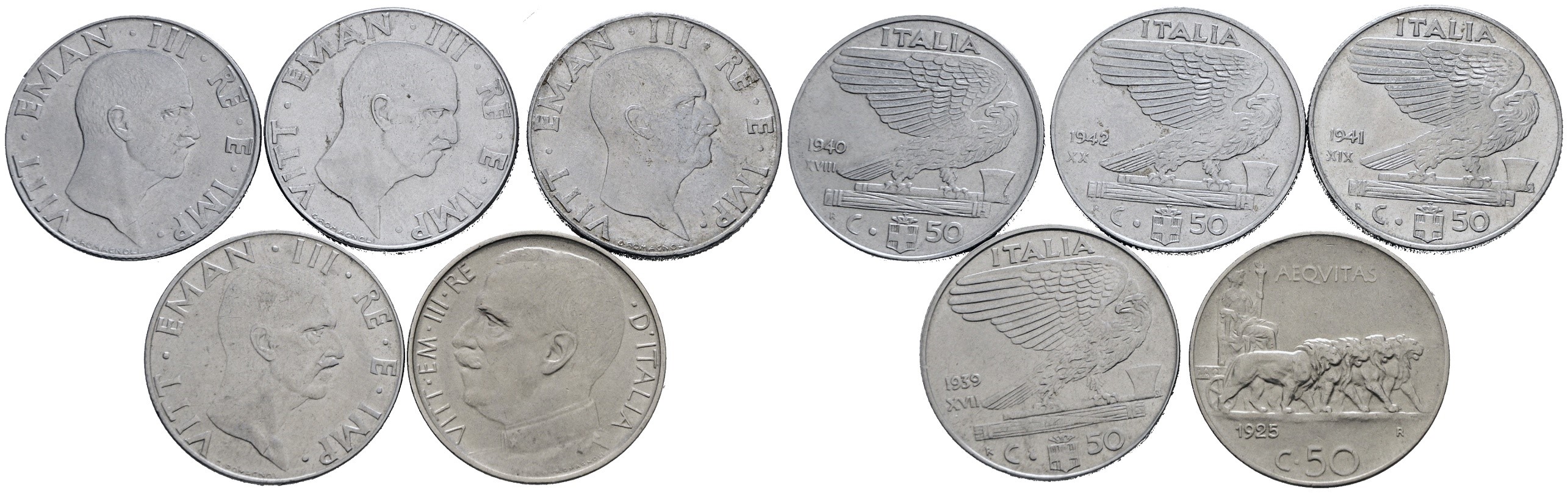 REGNO D'ITALIA. Vittorio Emanuele III (1900-1943). Lotto di 5 monete da 50 centesimi "Impero"; "Leoni". Date e conservazioni varie
