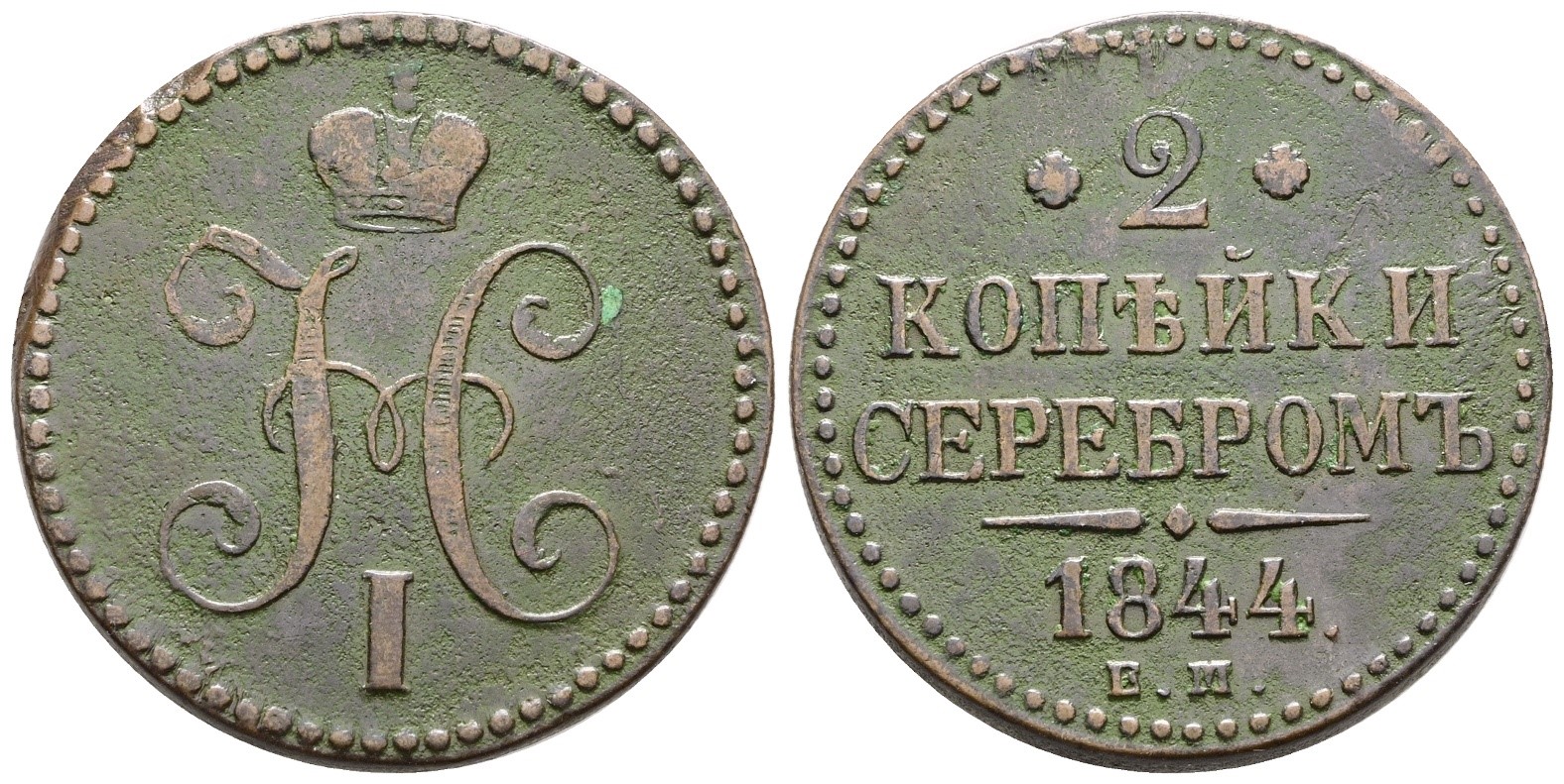 RUSSIA. EKATERININBURG. Nicola I (1825-1855). 2 copechi 1844. Cu; 20,48gr; C 145; BB+