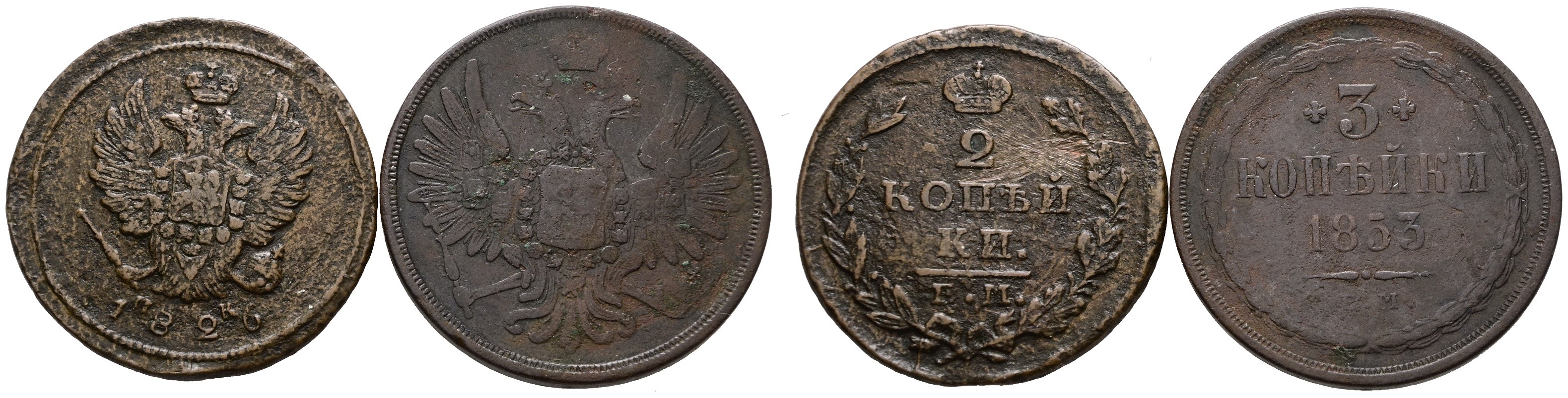RUSSIA. Nicola I (1825-1855). Lotto di 2 monete: 2 copechi 1826; 3 copechi 1853. Cu; Conservazioni varie
