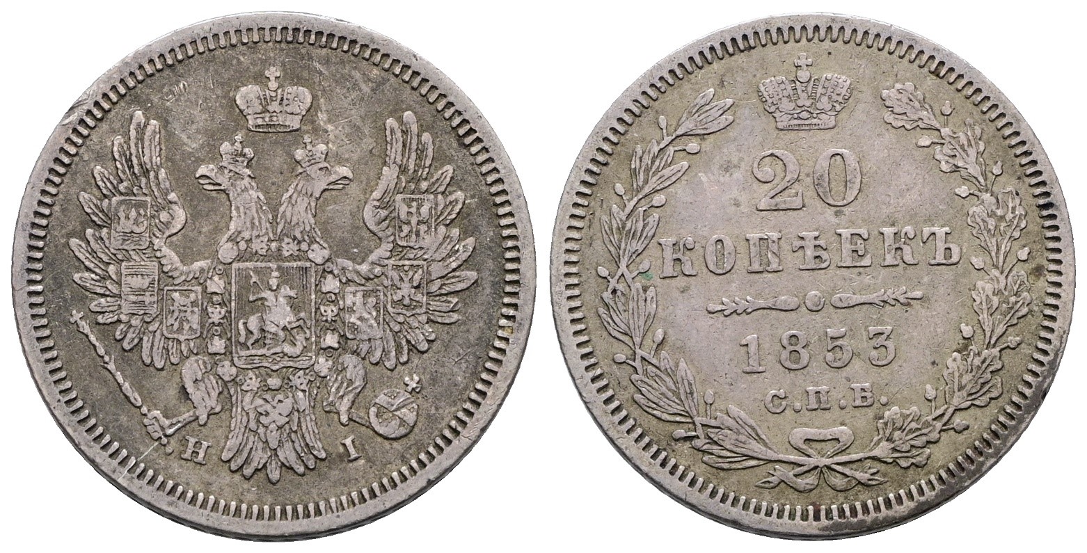 RUSSIA. SAN PIETROBURGO. Nicola I (1825-1855). 20 copechi 1853. Ag; 4,14gr; C 165; BB/SPL