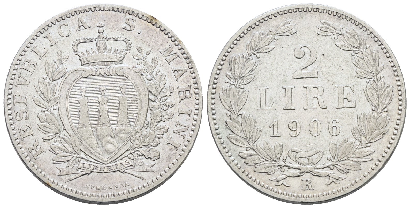 SAN MARINO. Vecchia monetazione (1864-1938) 2 lire 1906. Ag; 10gr; Gig.26; Raro; BB/SPL