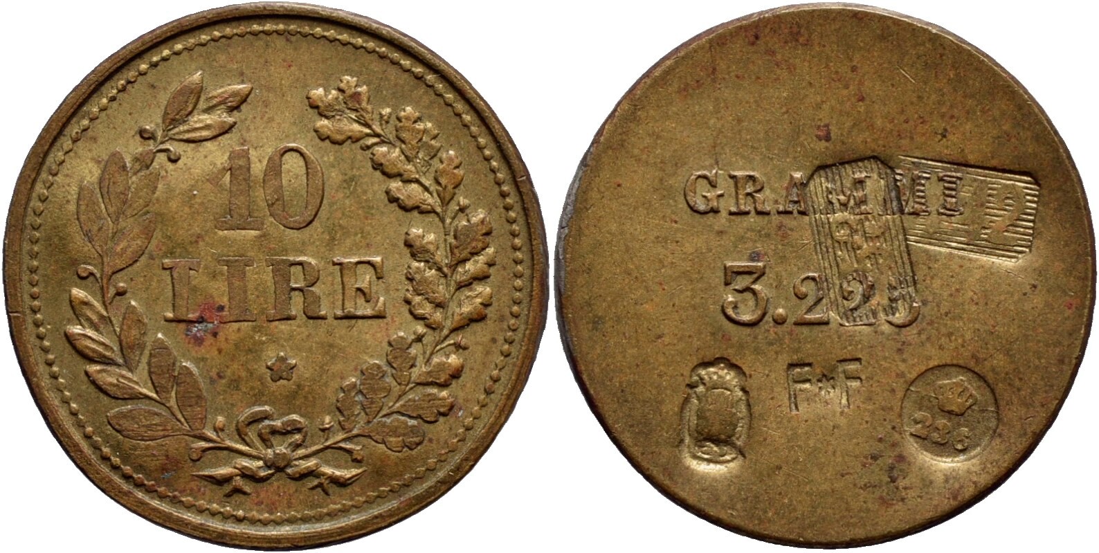 SAVOIA - Peso monetale 10 Lire Ø: 18 mm. - (BR g. 3,22) RR Borz. 615 Contromarche. SPL+