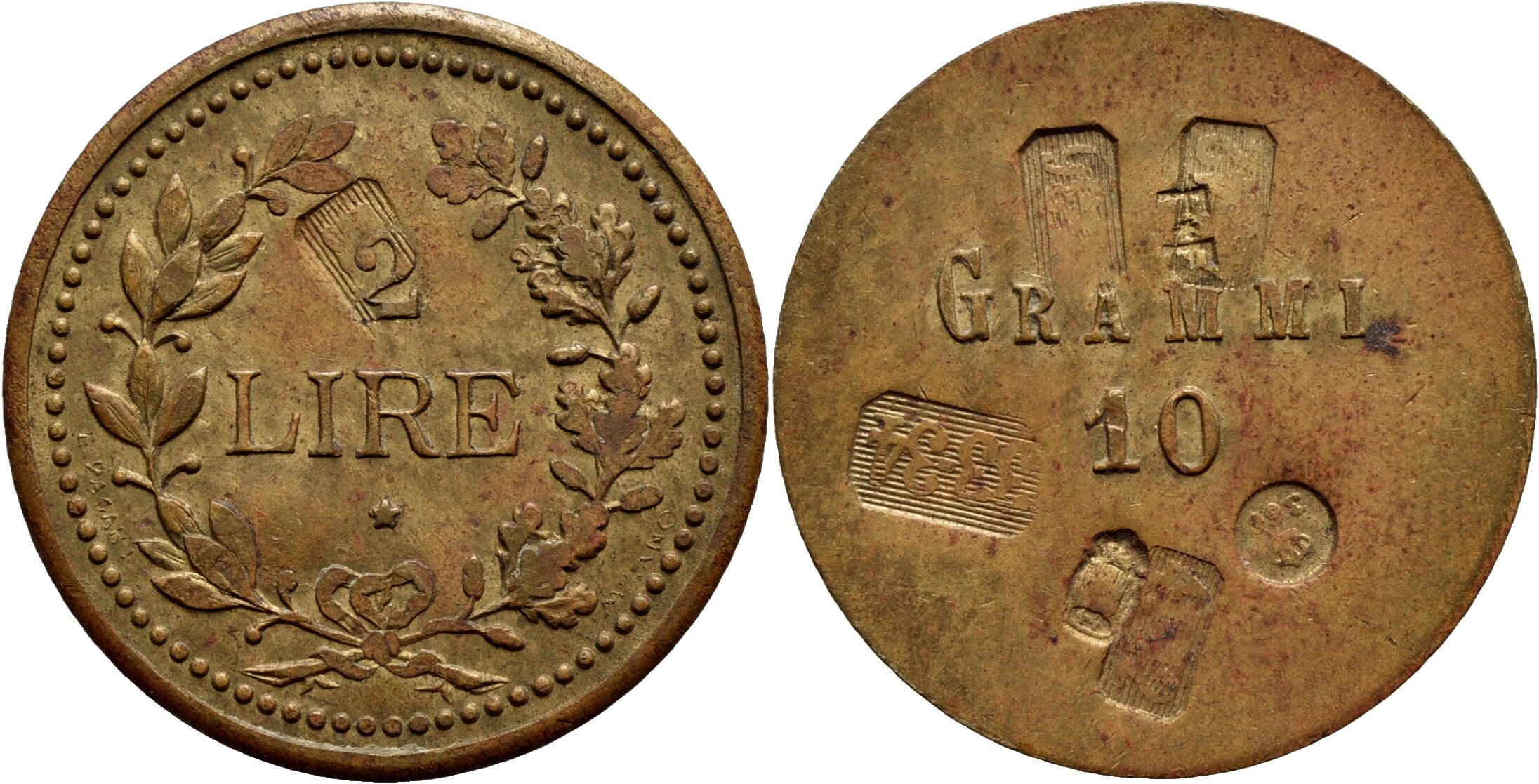 SAVOIA - Peso monetale 2 Lire Ø: 24 mm. - (BR g. 10) RR Borz. manca Per le 2 lire d'argento Contromarche. SPL