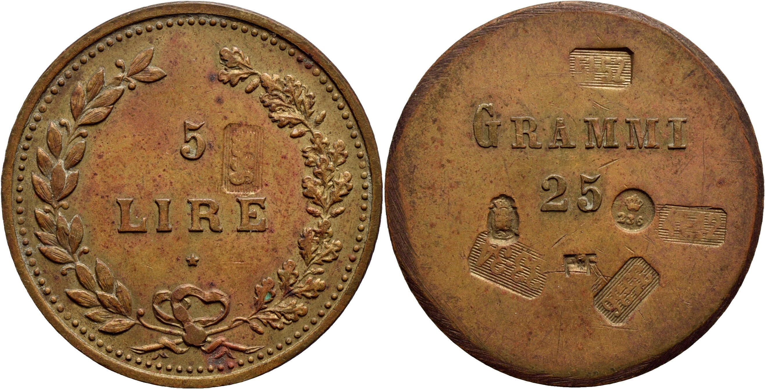 SAVOIA - Peso monetale 5 Lire Ø: 30 mm. - (BR g. 24,98) RR Borz. manca Per le 5 lire d'argento Contromarche. qFDC