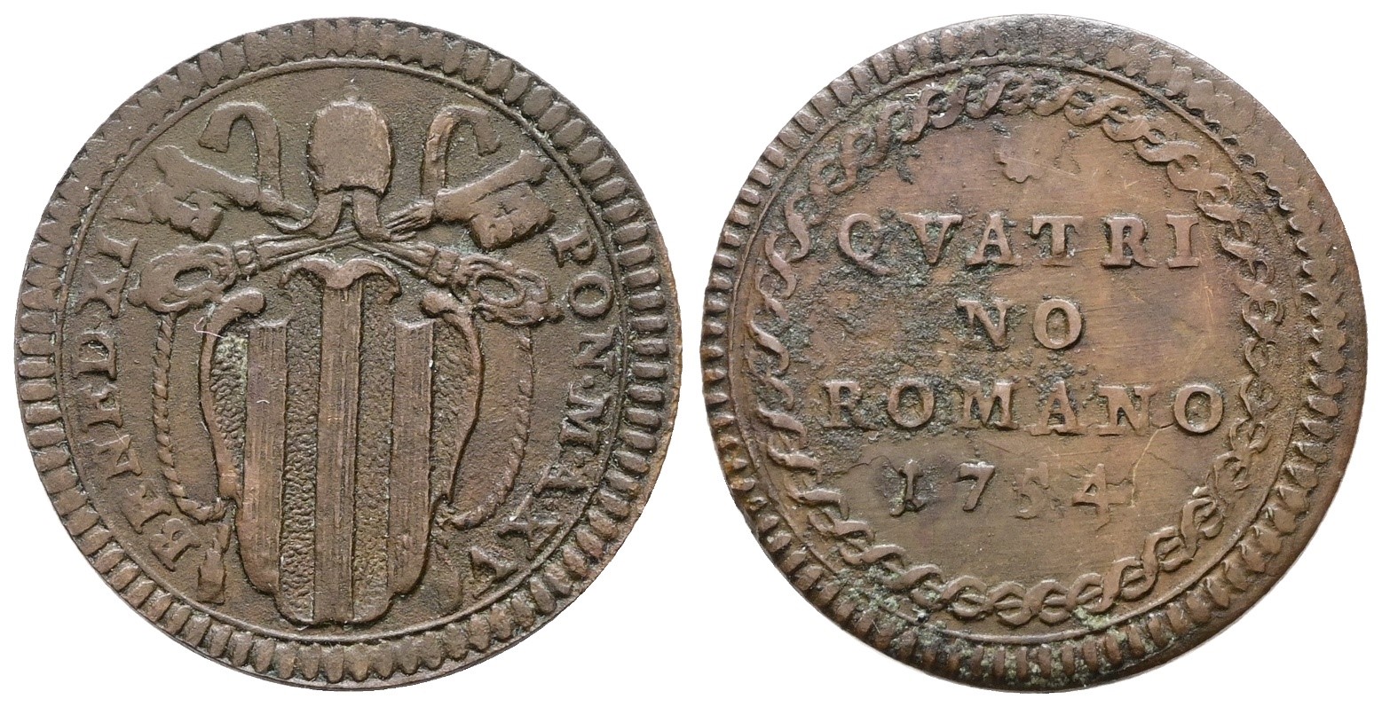 STATO PONTIFICIO. ROMA. Benedetto XIV (1740-1758). Quattrino 1754 a.XV. Cu; 2,3gr; Munt.216a; MIR 2625/6; Raro; BB/SPL