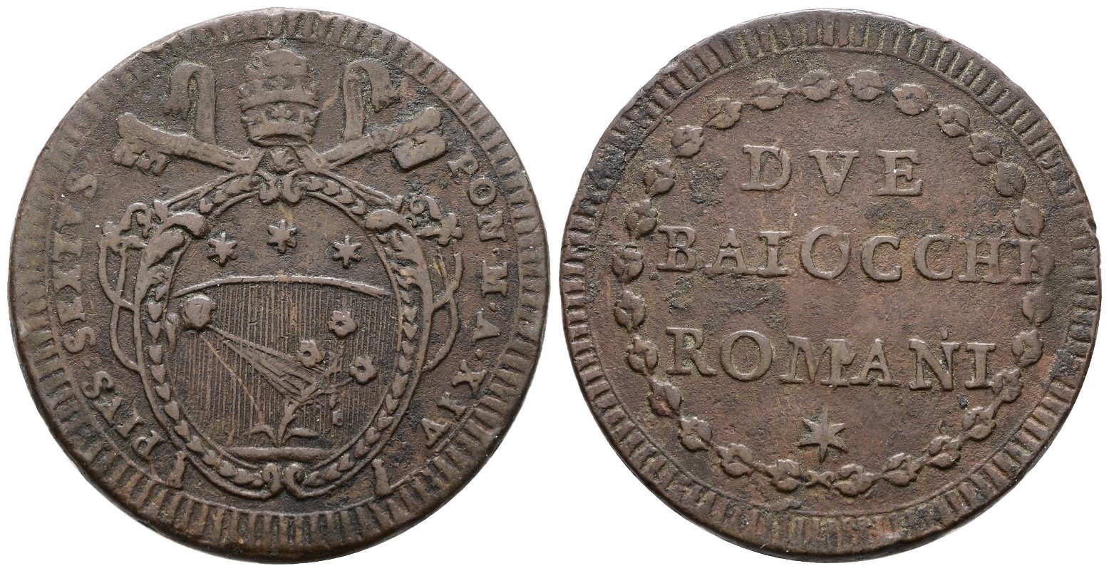 STATO PONTIFICIO. ROMA. Pio VI (1775-1799). 2 baiocchi anno XIV. Cu; 27gr; Munt.105a; MIR 2791/4; Raro; BB+