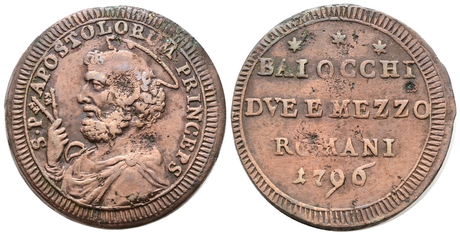 STATO PONTIFICIO. ROMA. Pio VI (1775-1799). Sampietrino da 2,5 baiocchi 1796. Cu; 16,9gr; Munt.99; MIR 2797/1; BB+