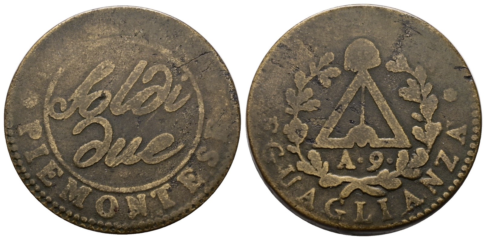 TORINO. Repubblica Piemontese (1798-1799). 2 soldi anno 9. Cu; 10,7gr; Gig.3; Q.BB