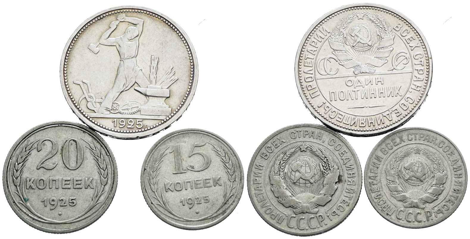 URSS. Lotto di 3 monete da 50, 20, 15 copechi 1925. Ag; Conservazioni varie.
