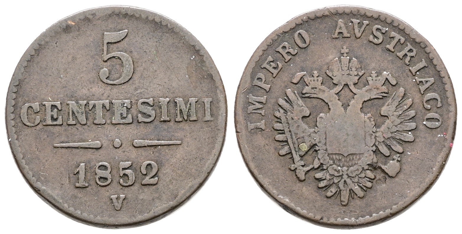 VENEZIA. REGNO LOMBARDO VENETO. Francesco Giuseppe (1848-1866). 5 centesimi 1852. Cu; 5,47gr; Gig.31; NC; MB/BB