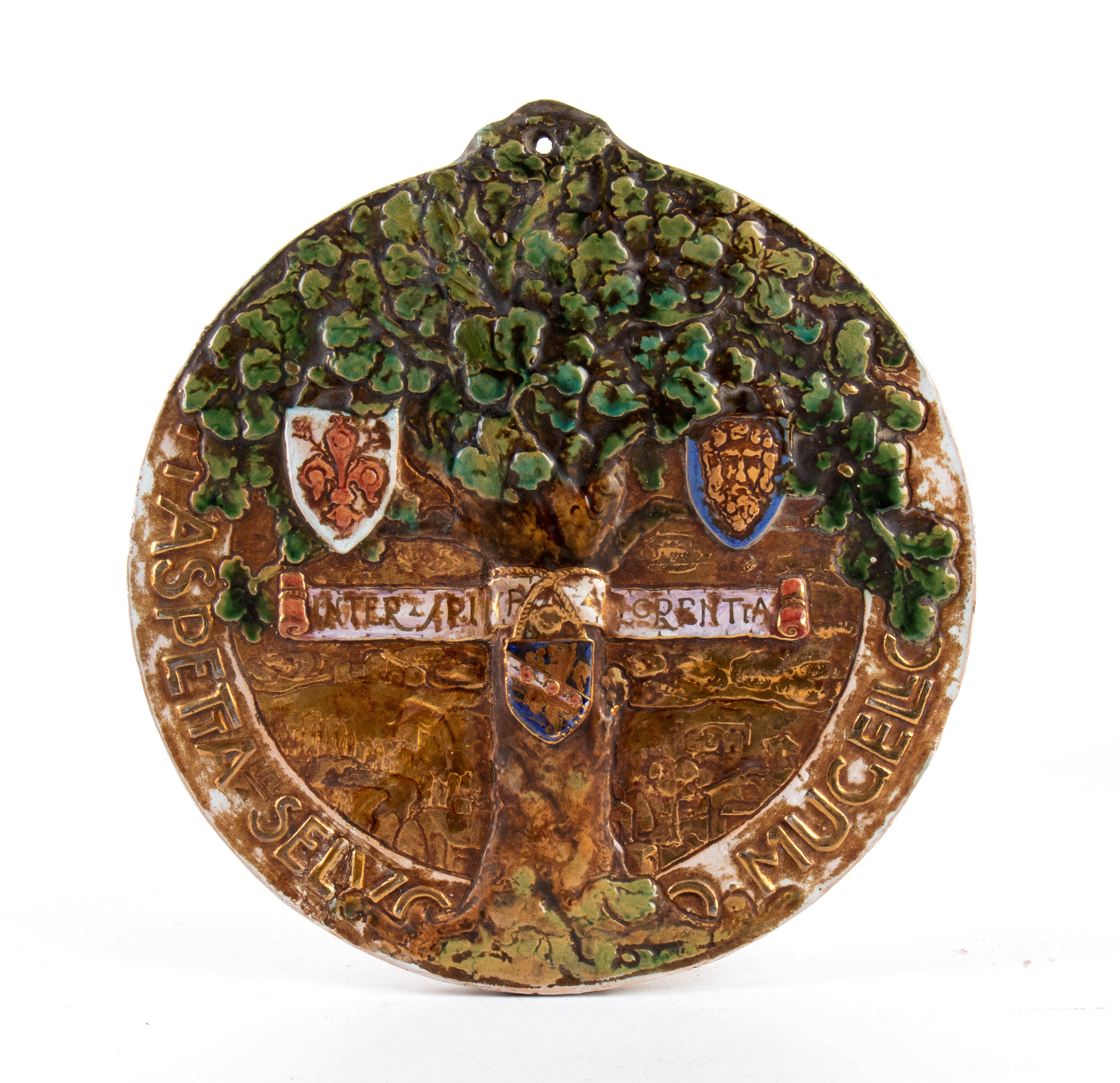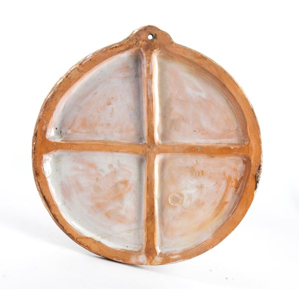 Ceramica commemorativa derivante dal retro della medaglia dedicata al Console Baldi, a testimonianza dell'amicizia tra il Console (fondatore del PNF del Mugello) e Chini. Al retro simbolo Grata della Fornace San Lorenzo, Mugello