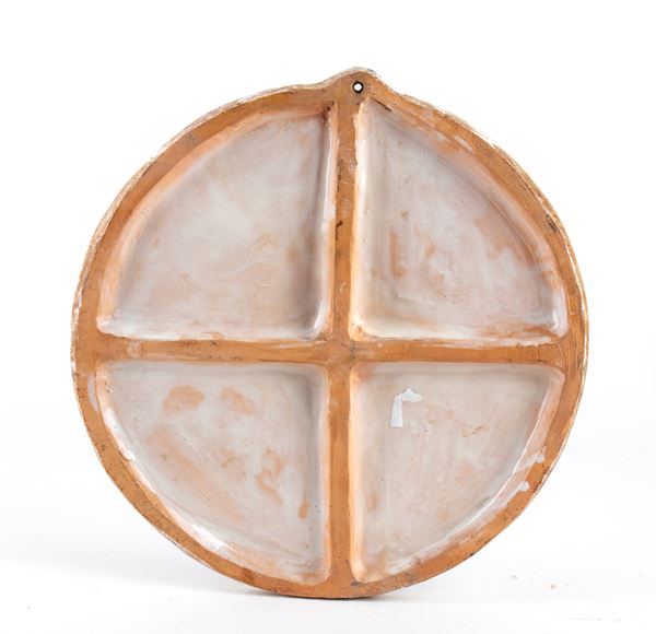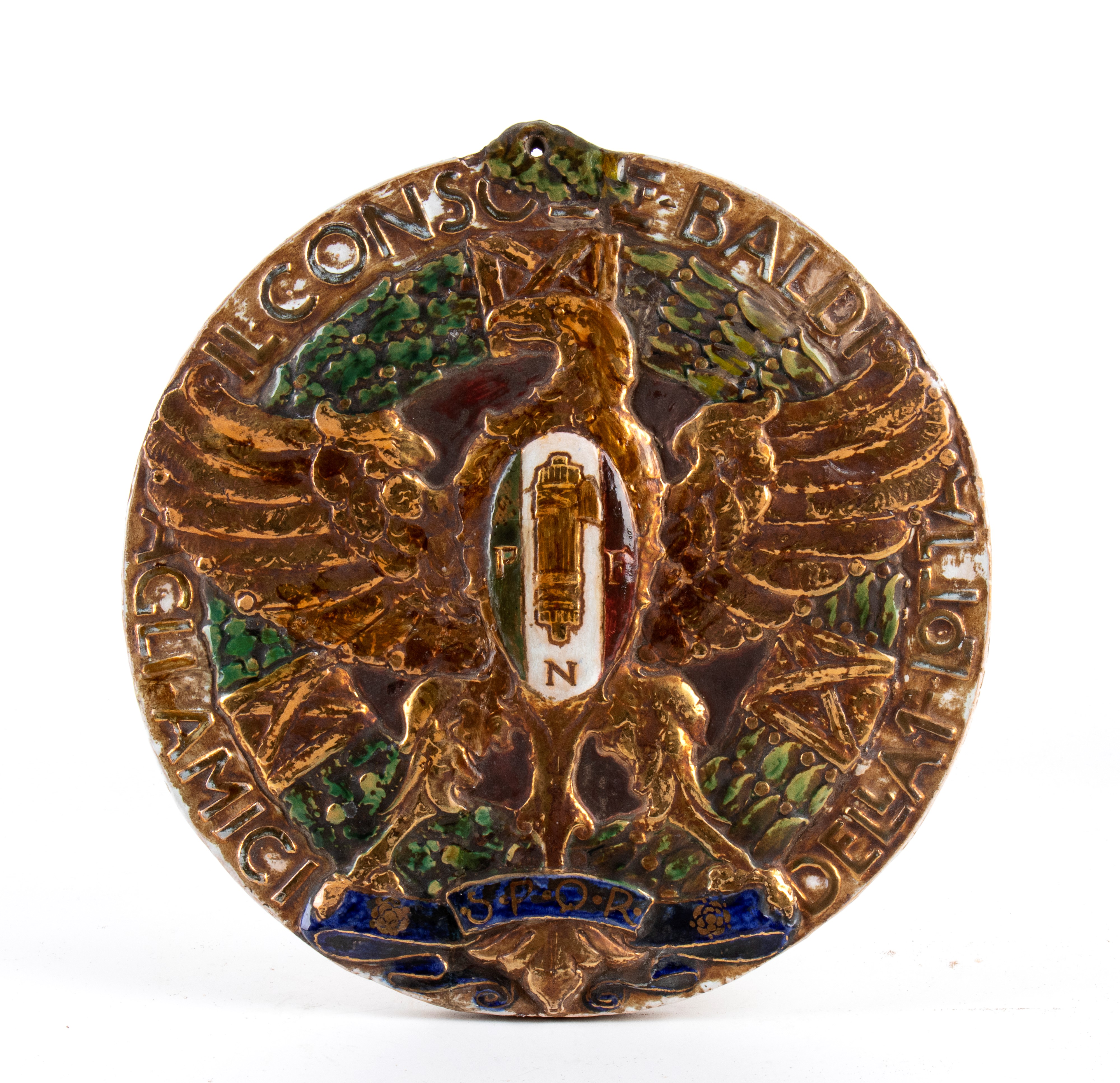 Ceramica commemorativa derivante dal fronte della medaglia dedicata al Console Baldi, a testimonianza dell'amicizia tra il Console (fondatore del PNF del Mugello) e Chini. Al retro simbolo Grata della Fornace San Lorenzo, Mugello