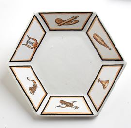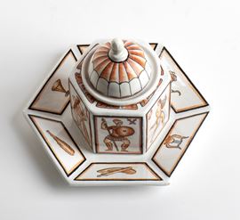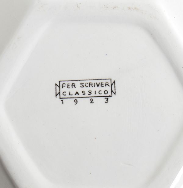 Calamaio in terraglia forte a colaggio a sezione esagonale con serbatoio, piatto e coperchio decorato con figure, nomi e simboli di sei divinità del pantheon olimpico su fondo bianco e sulle tonalità del marrone. Timbro sotto la base del calamaio: Richard-Ginori, S. Cristoforo, Milano; titolo e anno sotto la base del piattino: Per scriver classico, 1923