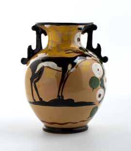 Vaso con decorazione di antilope e donna. Attribuzione data da etichetta accompagnante l'oggetto della galleria Solarte di Renato Miracco con indicazione: Virgilio Retrosi per Gualdo, 1925