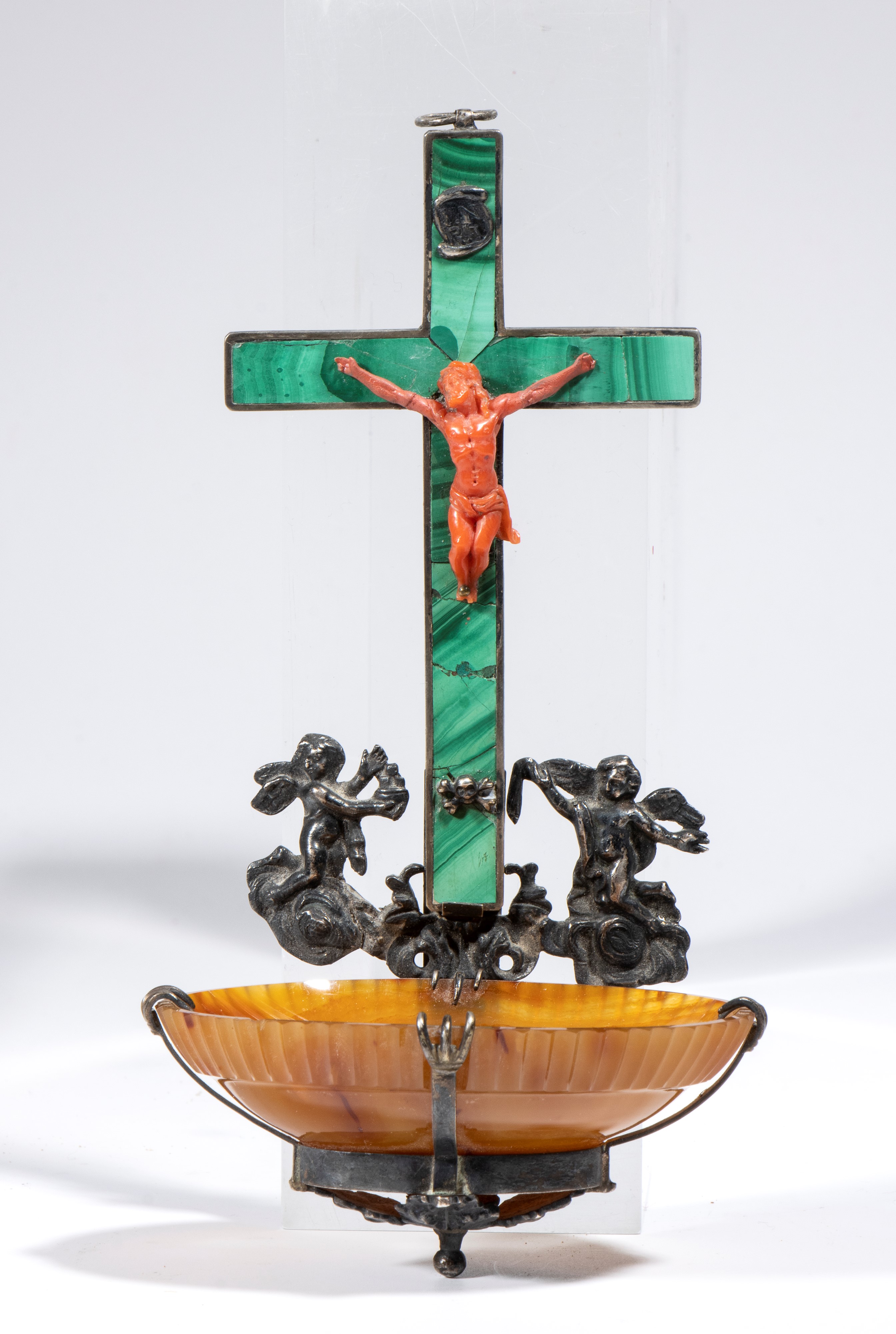 composta da una Croce in malachite sulla quale è applicato un piccolo Crocifisso Corpus Christi in corallo scolpito. Il bacino per l'acqua santa è costituito da una coppa semicircolare realizzata in agata. La croce e la coppa sono unite da elementi in metallo, che includono due putti alati in posizione simmetrica. Sulla sommità della croce è presente un anello per la sospensione.