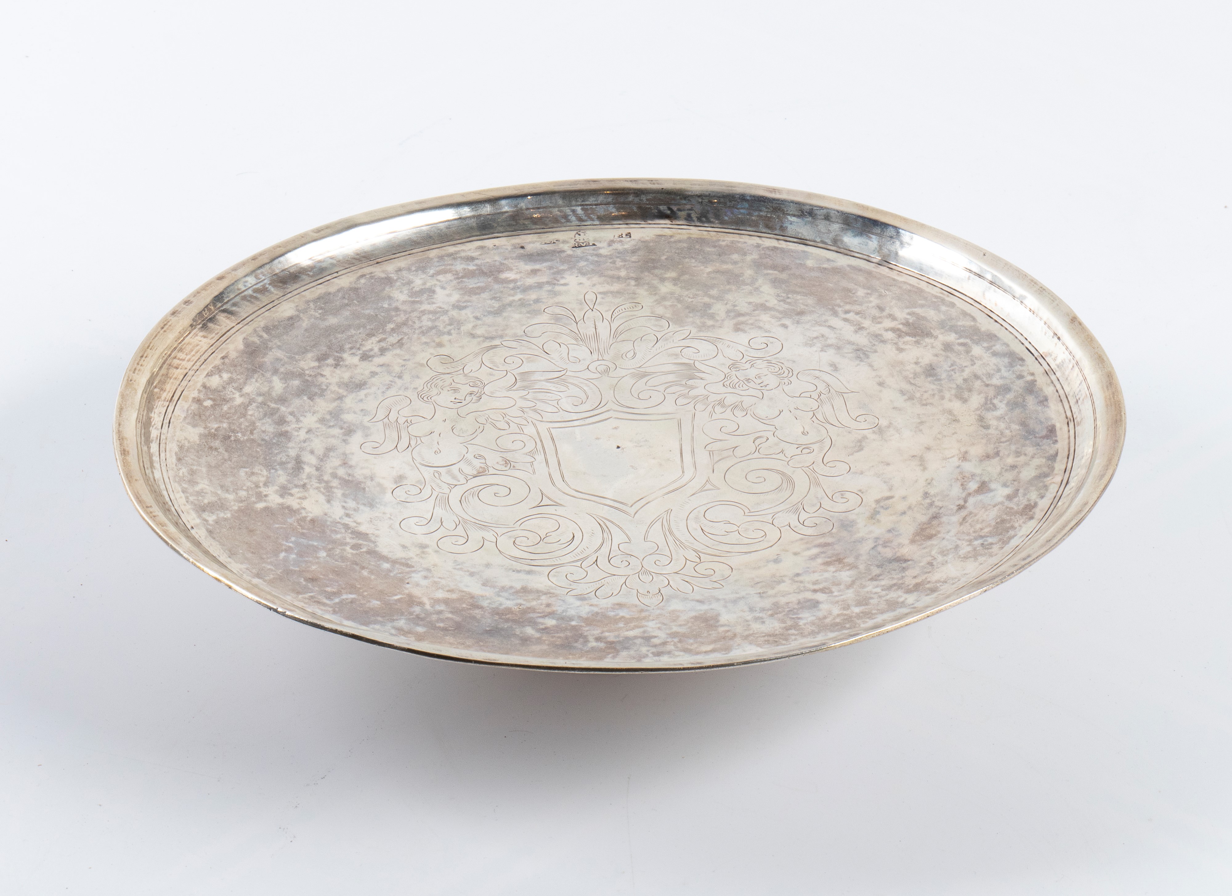 di forma circolare. Il piano è centrato da uno scudo inciso, circondato da una ricca decorazione a motivi fogliati.
