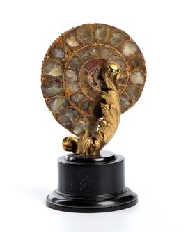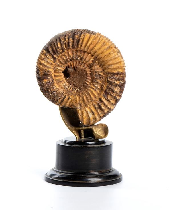 del genere Cleoniceras, caratterizzata da una conchiglia spiralata a sezione planispirale con camera interna ben visibile e superfici levigate. La colorazione varia dal bruno ambra al madreperlaceo, esaltando le venature naturali del fossile. L’ammonite è imperniata verticalmente ad un supporto in metallo dorato finemente lavorato a motivi fogliati, che funge da elemento di raccordo decorativo, poggiante su una base cilindrica tornita in legno ebanizzato.