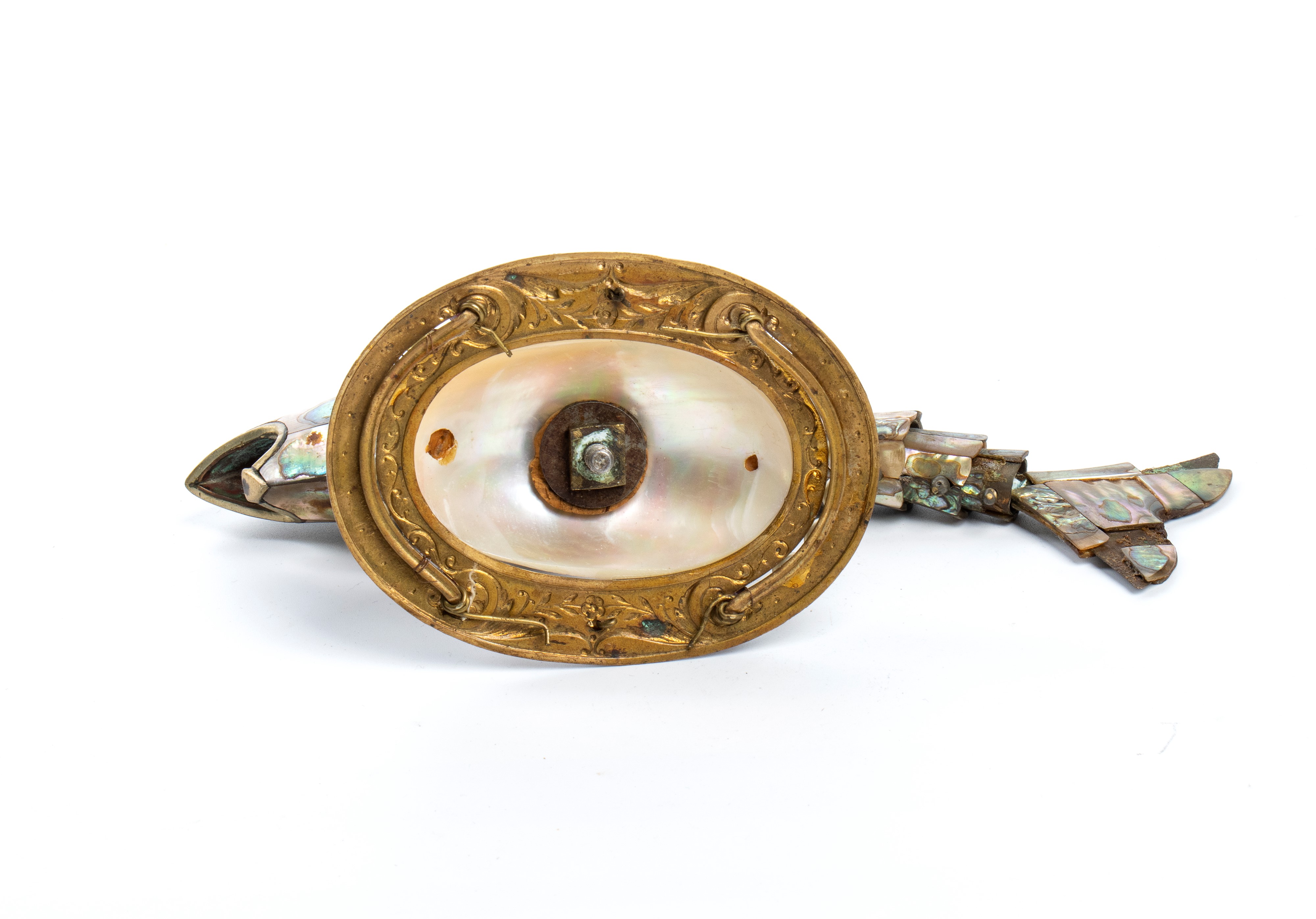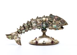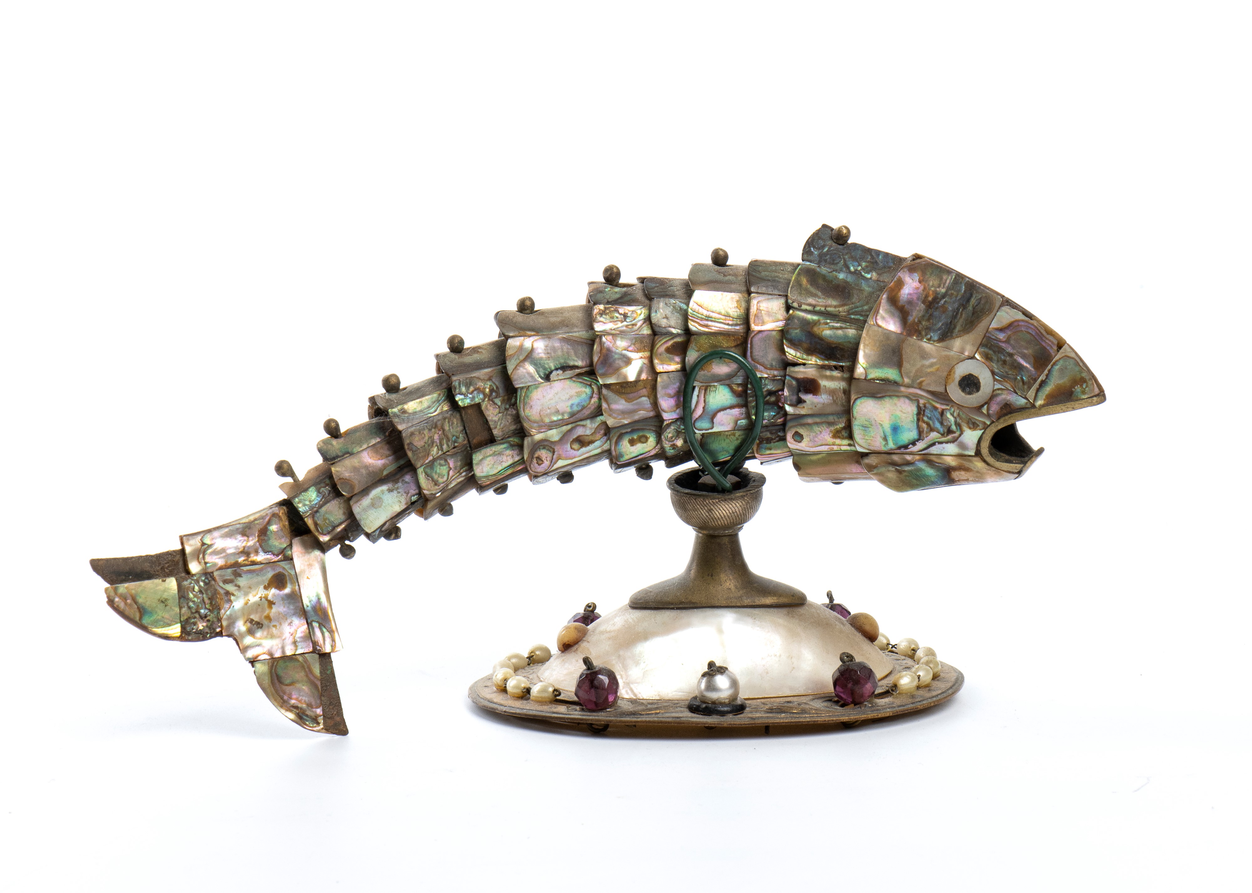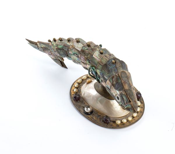 realizzato in forma di pesce snodabile, con corpo rivestito da placche di madreperla. La bocca funge da apribottiglie. La struttura articolata consente un movimento fluido del corpo, richiamando le antiche lavorazioni imitanti il pesce vivo, ma reinterpretate in chiave moderna.Il manufatto è montato su base ovale in madreperla, arricchita da applicazioni decorative.