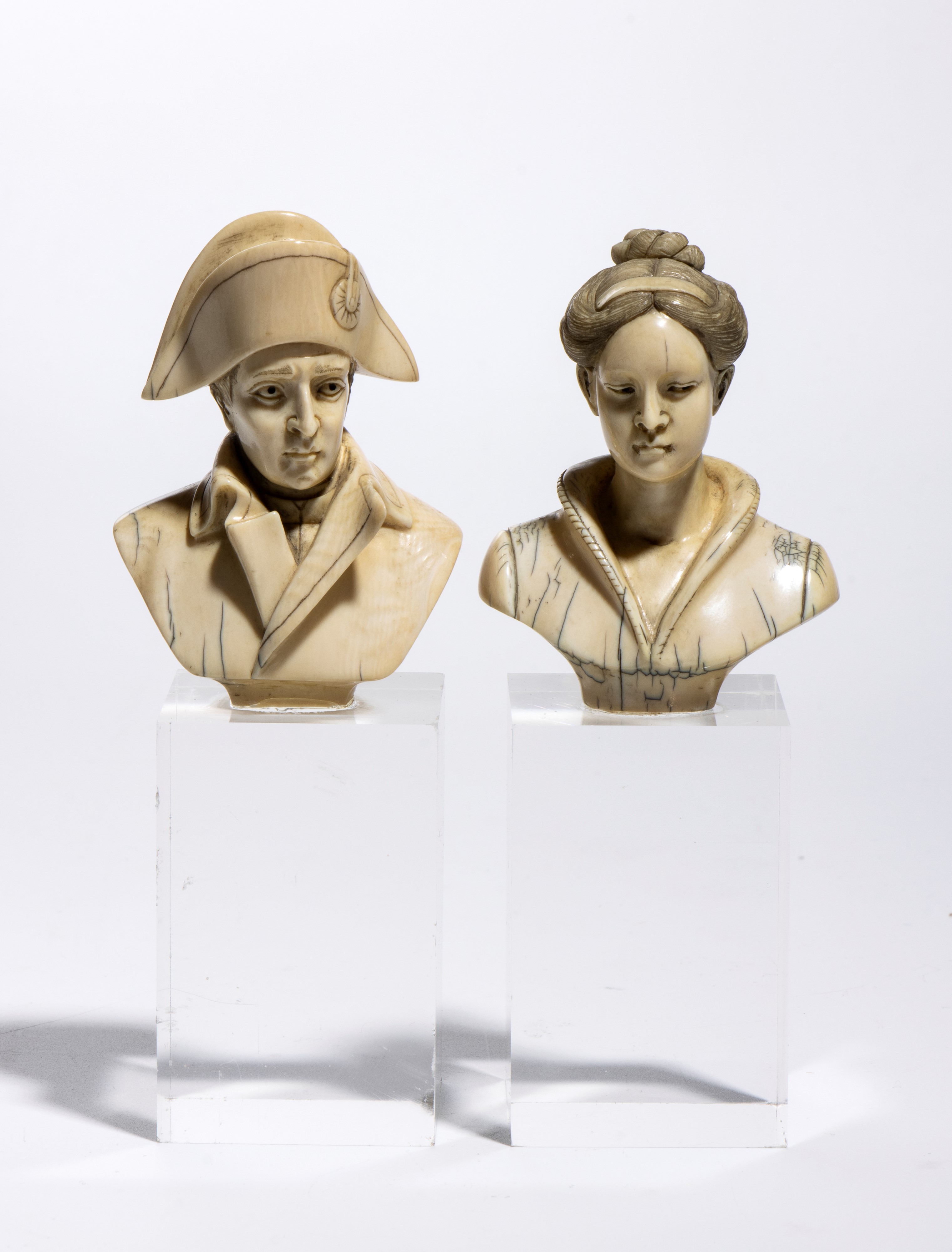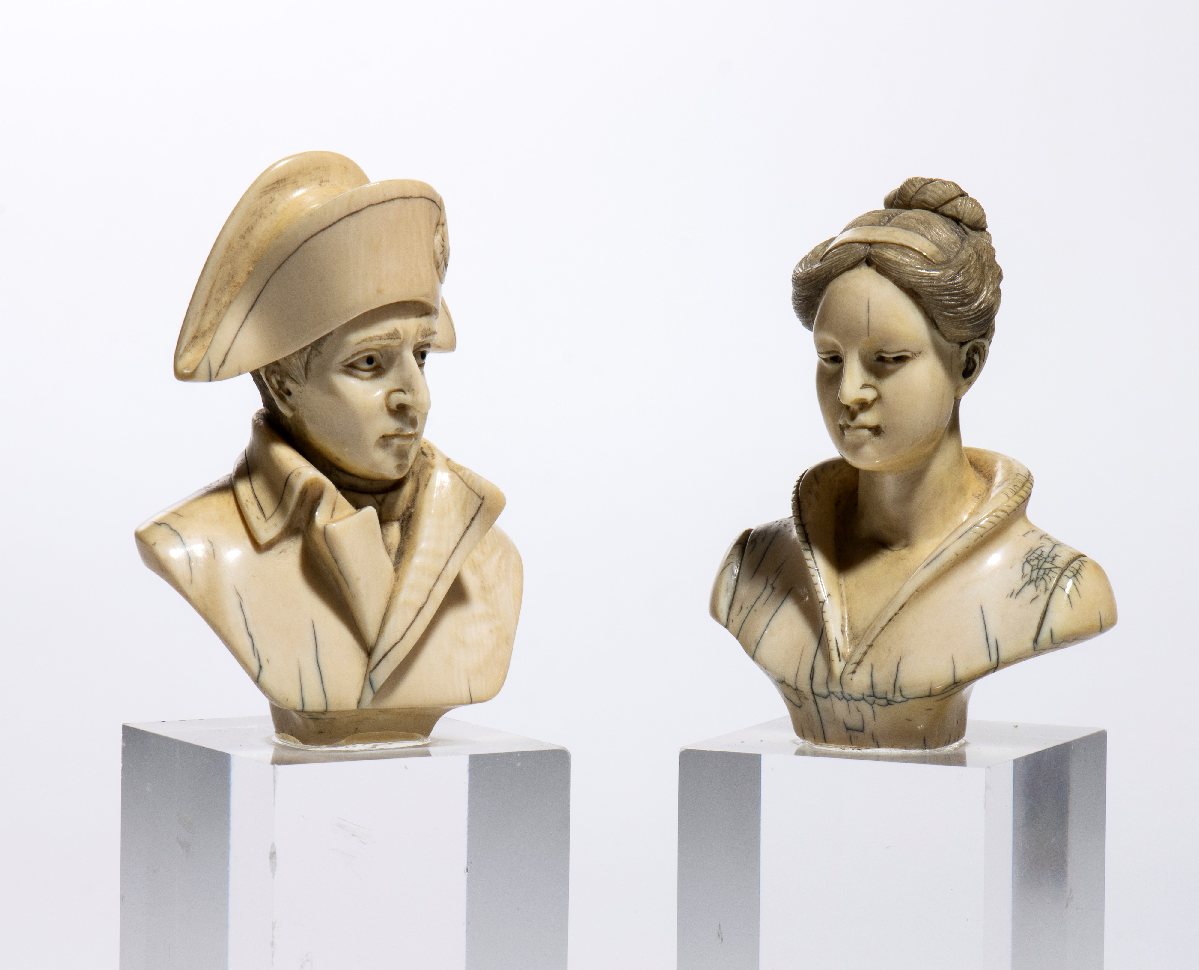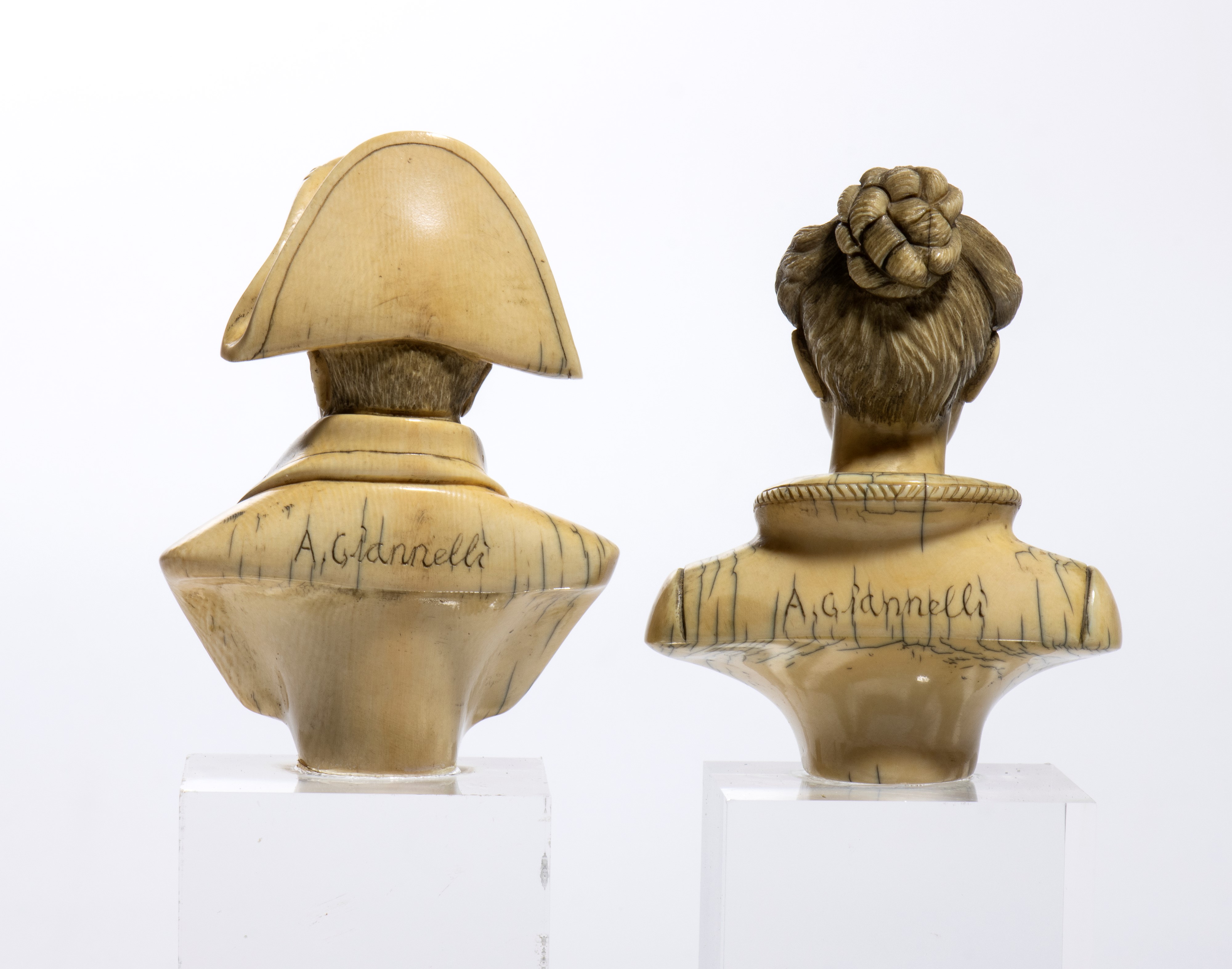 raffiguranti un uomo e una donna. Il busto femminile rappresenta una giovane donna dai tratti orientali, con i capelli raccolti in un'acconciatura elaborata e un abito leggero dal profondo scollo a V. L’opera si distingue per la delicatezza delle linee del volto e l'equilibrio compositivo, enfatizzando un ideale estetico esotico e aggraziato. Il busto maschile raffigura invece un ufficiale napoleonico, riconoscibile dal tipico bicorno e dall’uniforme avvolgente. Lo sguardo pensoso e i dettagli dell'abbigliamento, resi con estrema perizia, richiamano l’iconografia classica di Napoleone Bonaparte, sebbene in una versione più stilizzata e raccolta. L’equilibrio tra la resa naturalistica dei volti e la finezza della lavorazione rende questi busti un esempio rappresentativo della produzione artistica di Arnaldo Giannelli.