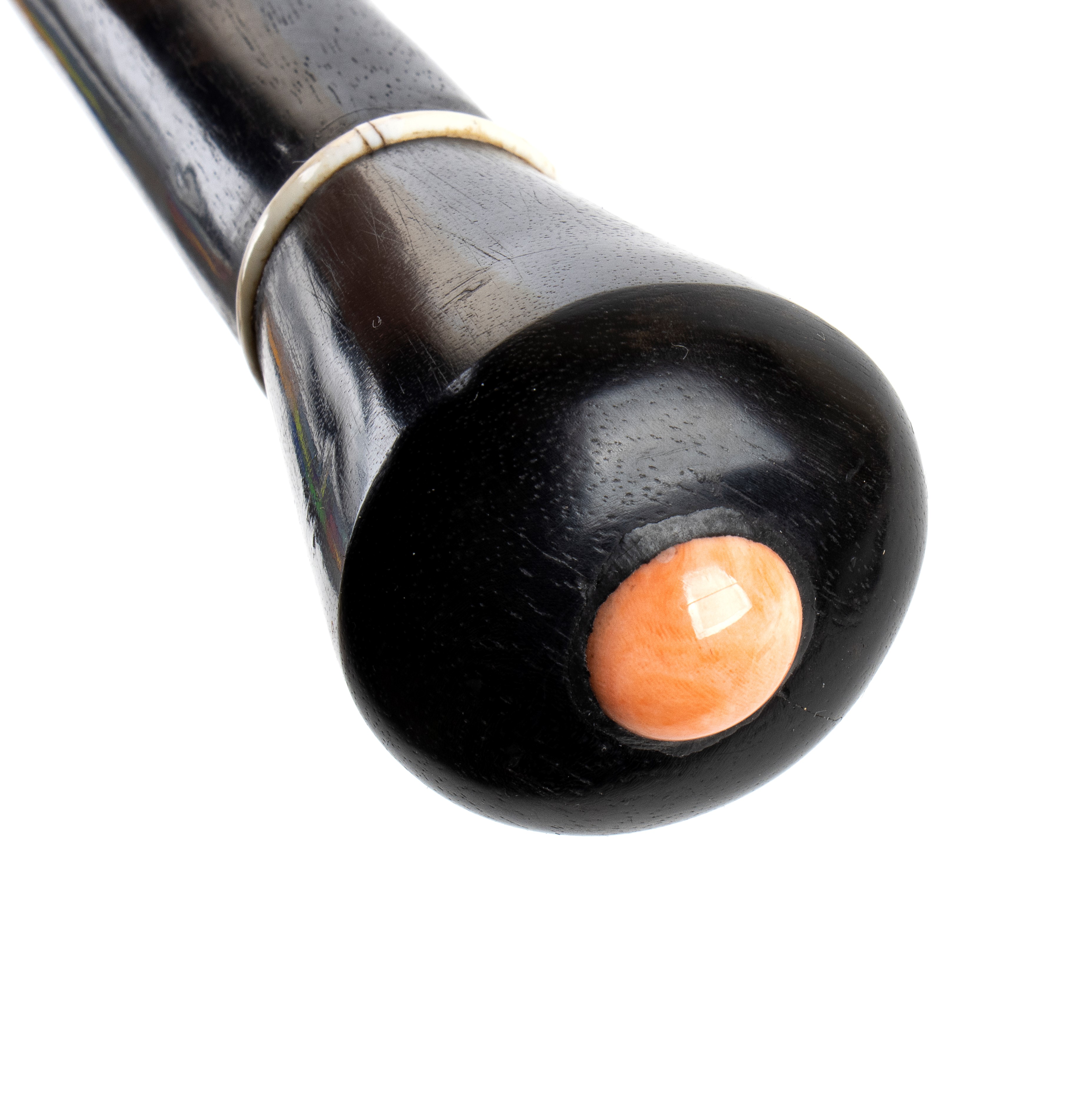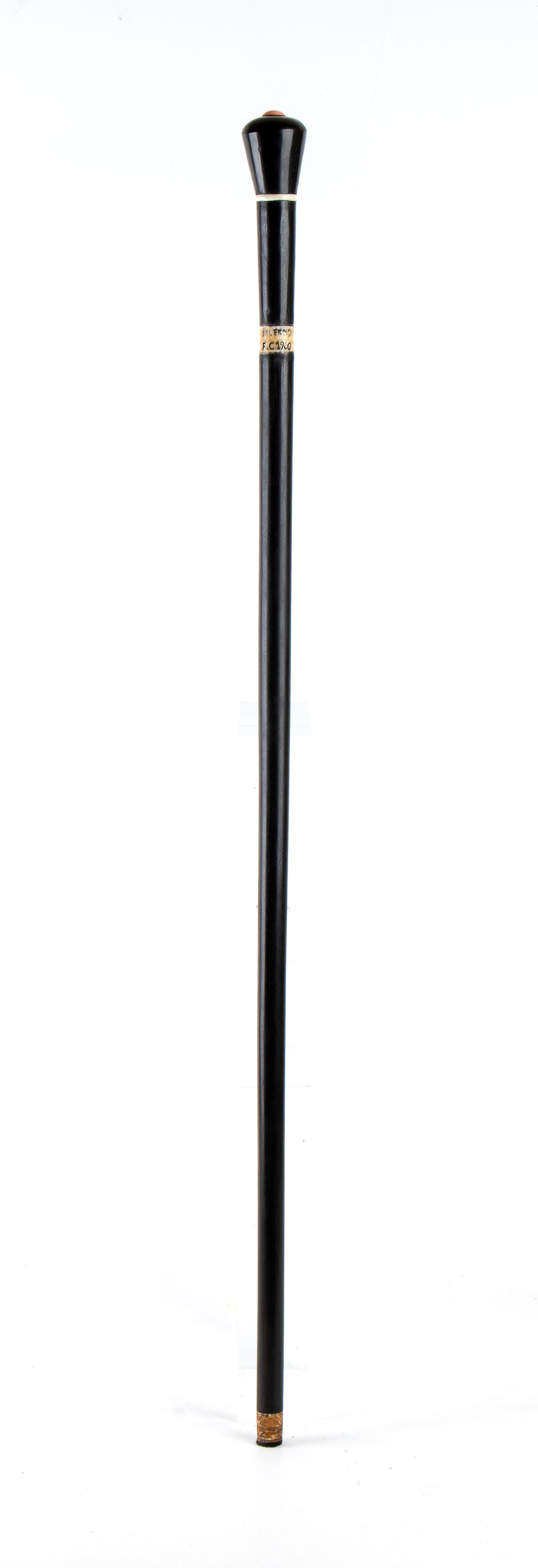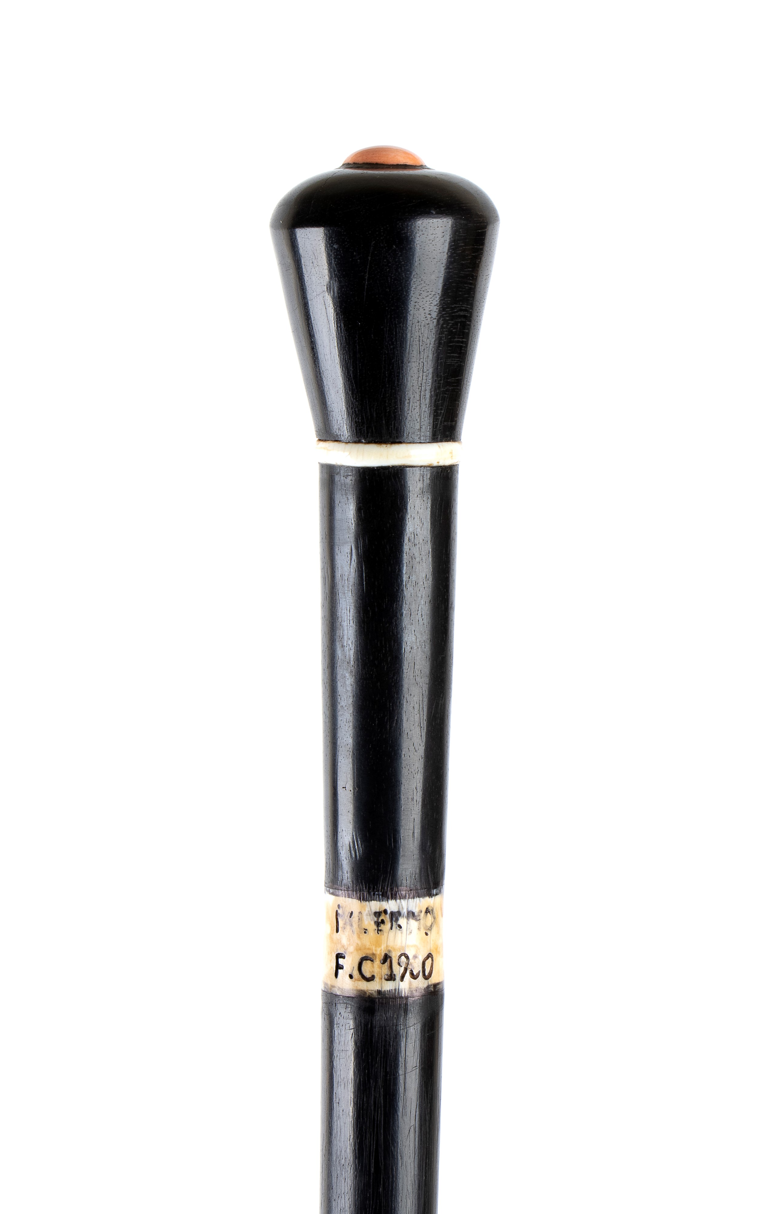 Il manico di forma arrotondata allungata di colore scuro, presenta un inserto circolare sulla sommità, identificabile come corallo Cerasuolo (Corallo cerasuolo, Corallum Eliatus). A separare il manico dal lungo corpo in legno, è presente un piccolo e stretto anello in avorio di elefante. Poco più in basso, è presente una sottile fascia di separazione, ugualmente in avorio, con una scritta postuma: “PALERMO F.C 1900”.