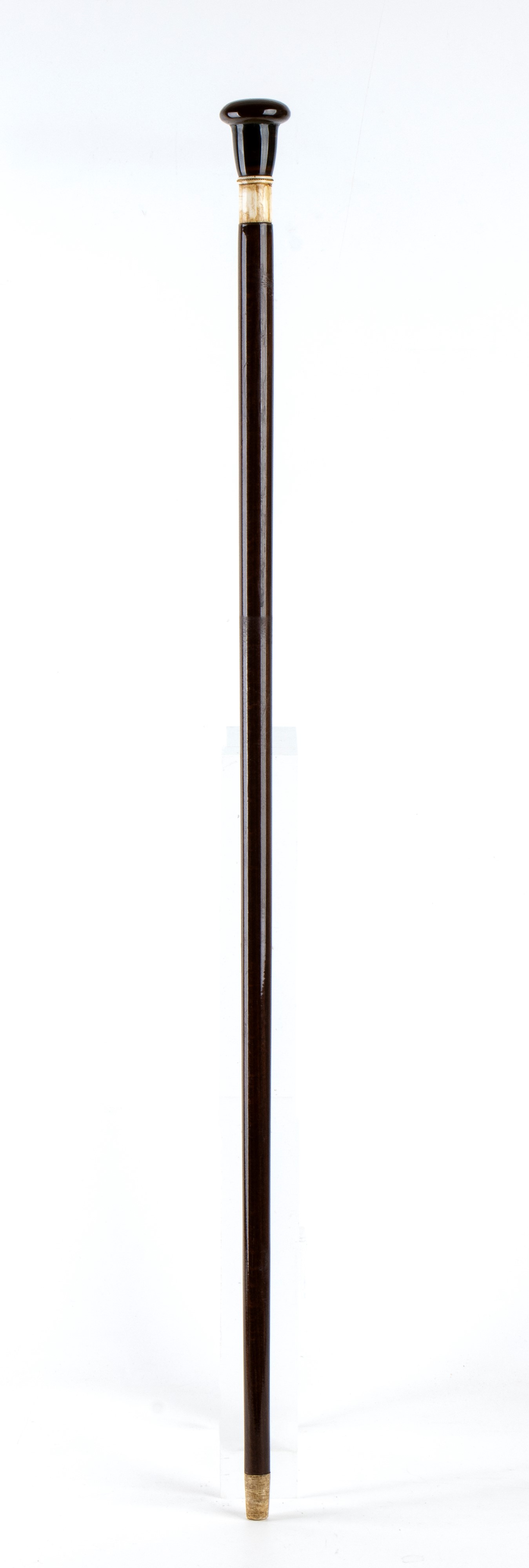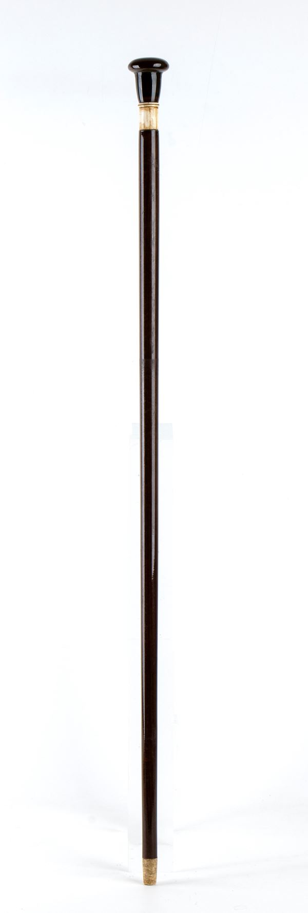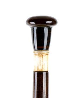 il manico di forma semi-sferica allungata di colore scuro, è realizzato con una pietra dura. Al di sotto è presente un elemento in avorio che funge da raccordo tra l’impugnatura e l'asta in legno, questo elemento è impreziosito da un piccolo bordino attorcigliato in metallo. Il lungo corpo in legno, termina in una punta realizzata in avorio di elefante, a richiamo della parte superiore del bastone.