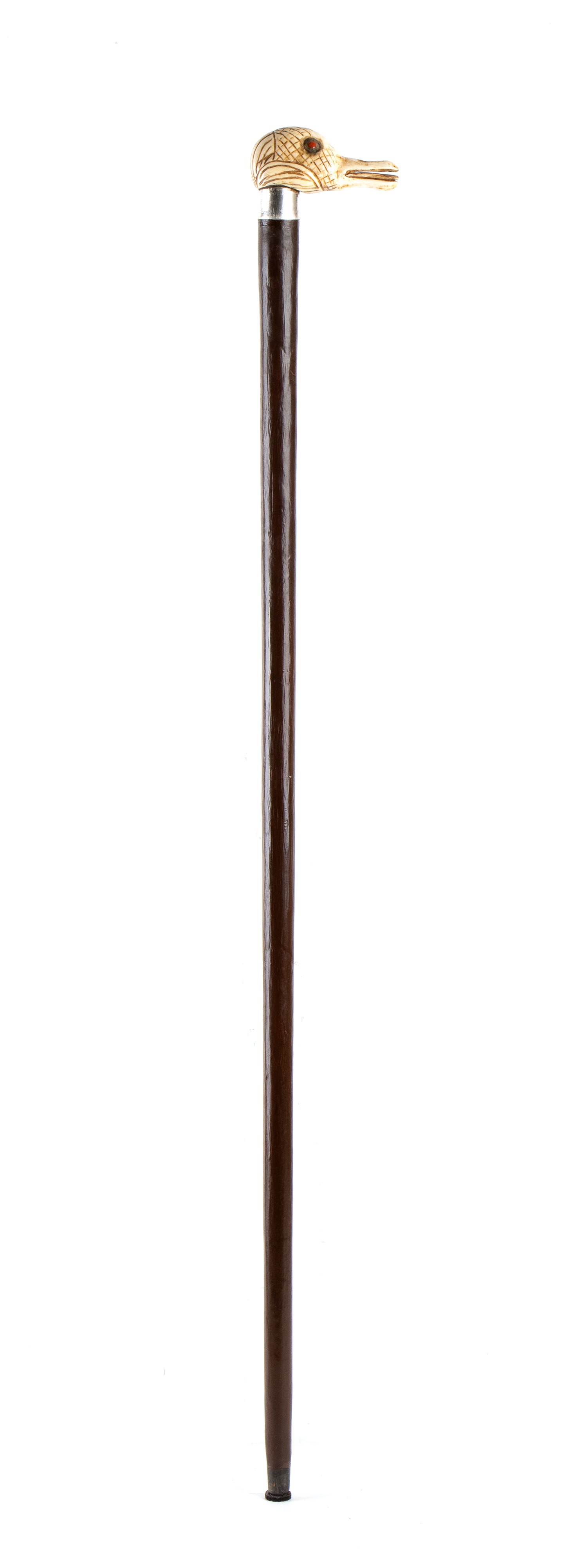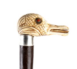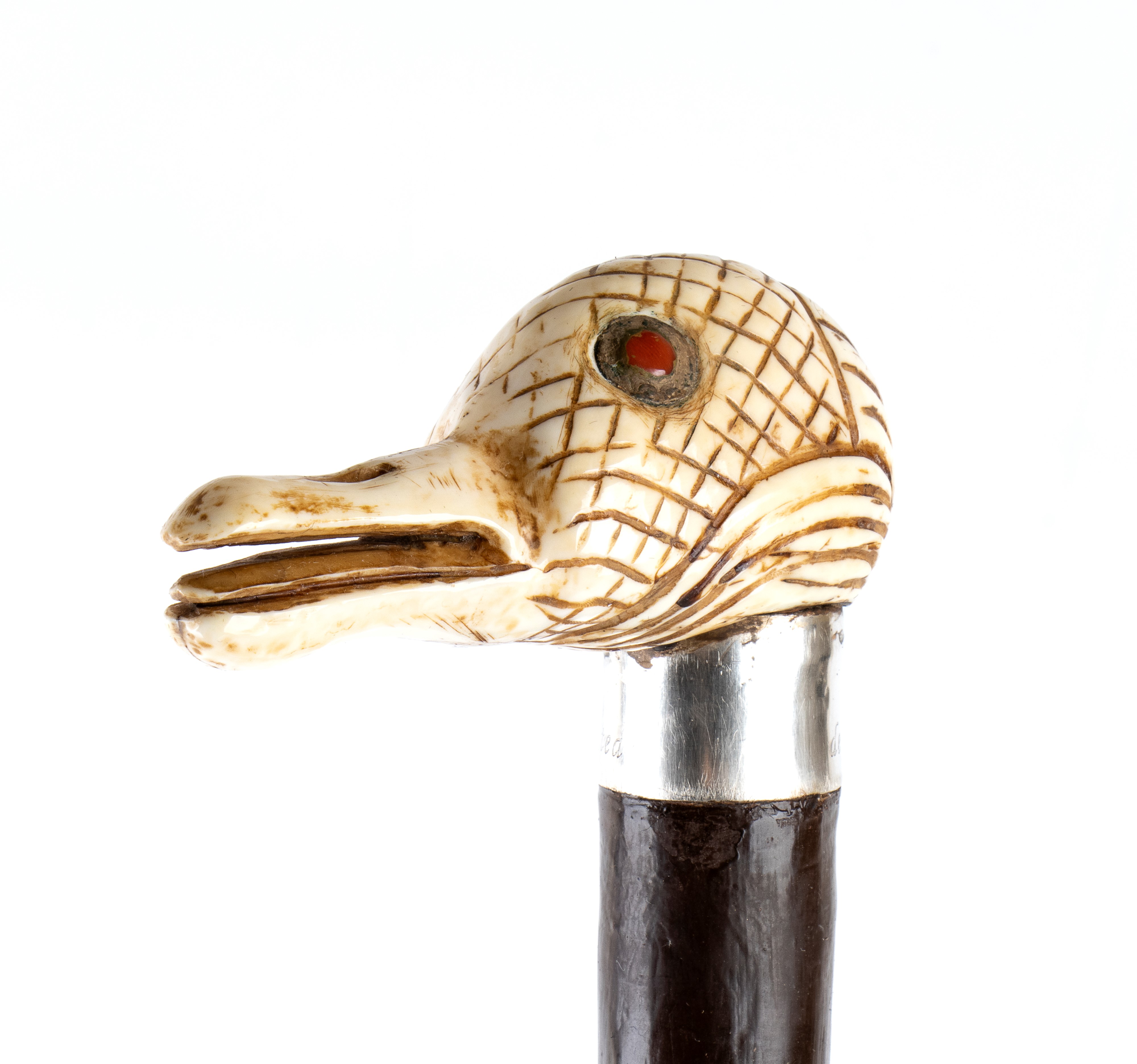 scolpito a forma di testa di anatra. La superficie del manico è decorata con un motivo incrociato che richiama le piume dell'animale. L'occhio della testa d'anatra è un elemento in corallo rosso del Mediterraneo. Sotto il manico si trova un elemento metallico inciso con la scritta: "Bruno Orioli Barone degli Amato di Amantea". Questo dettaglio indica che il bastone probabilmente apparteneva a una figura di nobiltà o comunque di alto rango.