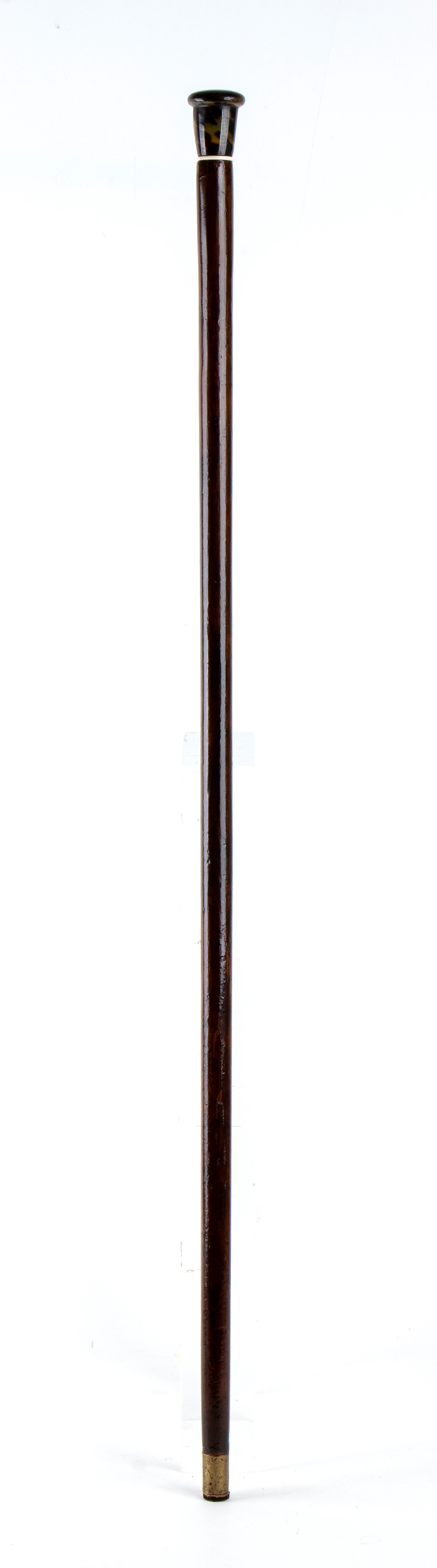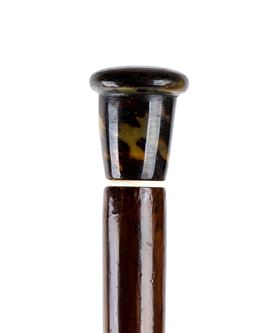 di forma arrotondata. La parte superiore è realizzata interamente in tartaruga e a collegare il manico all’asta del bastone c'è un sottile anello in avorio, che funge sia da elemento strutturale che decorativo. Il bastone in legno termina con un puntale in metallo.