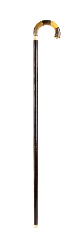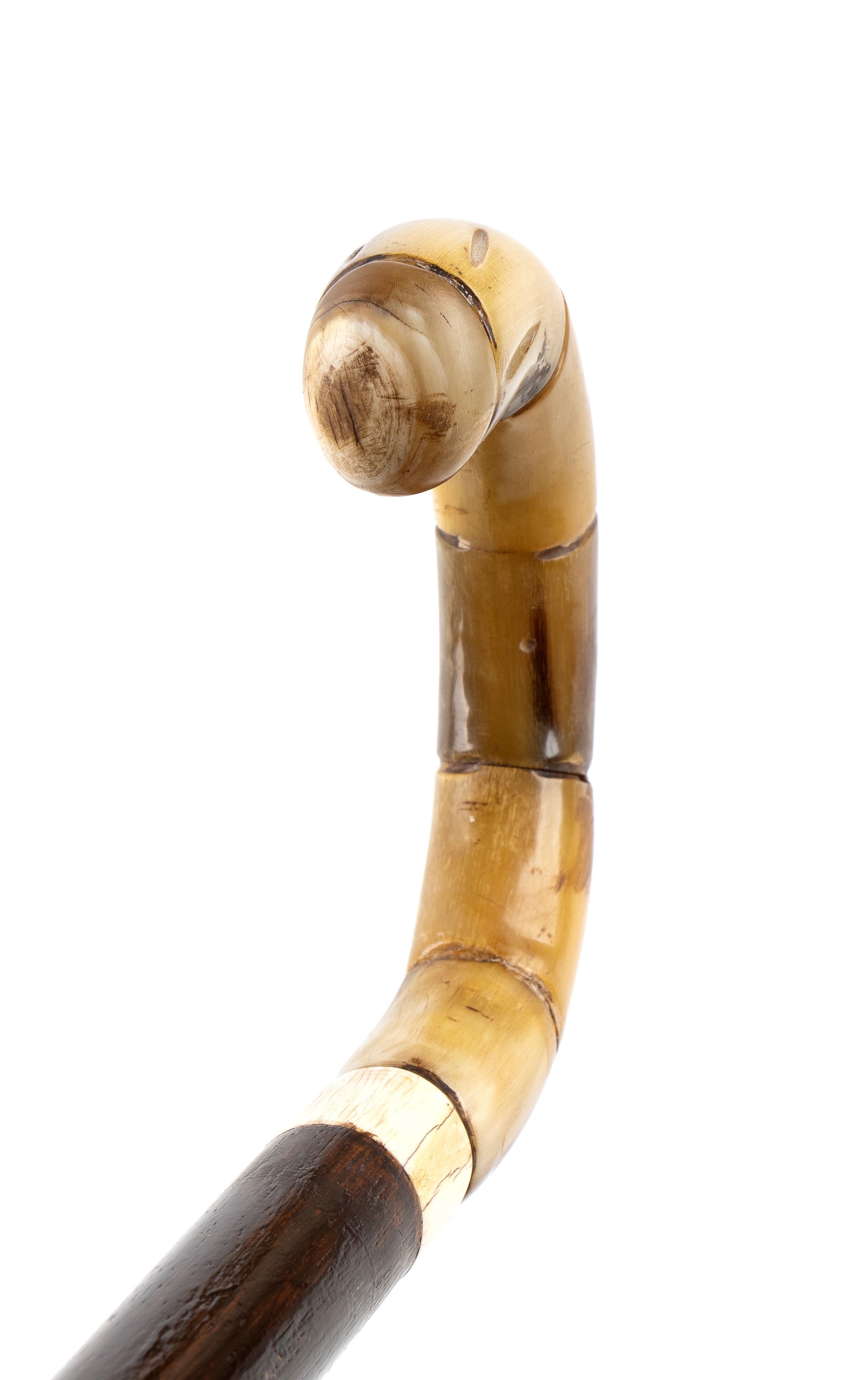 con il manico in forma incurvata, lavorato a sezioni, con materiali alternati in corno di rinoceronte color marrone miele e avorio di elefante.