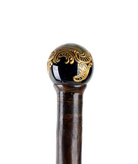 da passeggio con pomello in stile porcellana di Sèvres, decorato a mano, presenta una scena romantica: un uomo e una donna in abiti aristocratici immersi in un idilliaco paesaggio bucolico. Il pomello ha un fondo scuro e la scena è realizzata con colori pastello, incorniciata da un motivo decorativo color oro.
