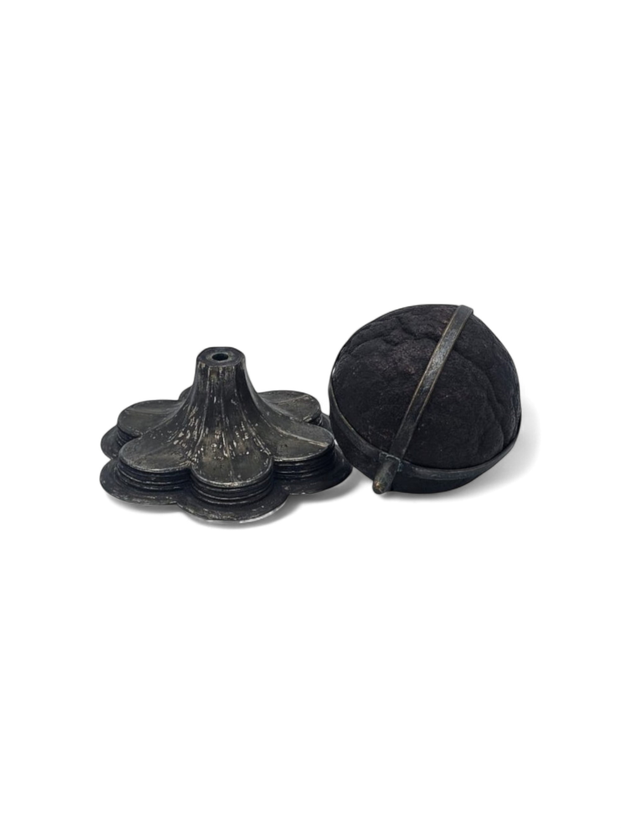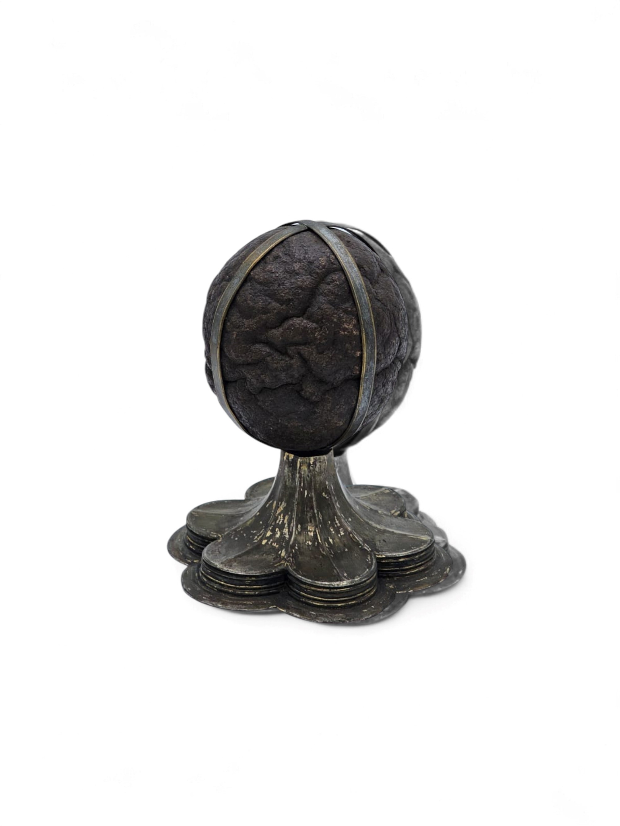dalla forma ampia e lobata, costituito da più lobi tondeggianti adiacenti, caratterizzati da un andamento curvilineo. Dal centro della base si eleva un piede dal profilo leggermente svasato. Il bezoar è fissato alla base tramite un motivo composto da quattro sottili fasce metalliche. L’oggetto rientra nella categoria delle opere da wunderkammer, collezioni in cui meraviglia e saperi si incontravano in oggetti unici e straordinari.