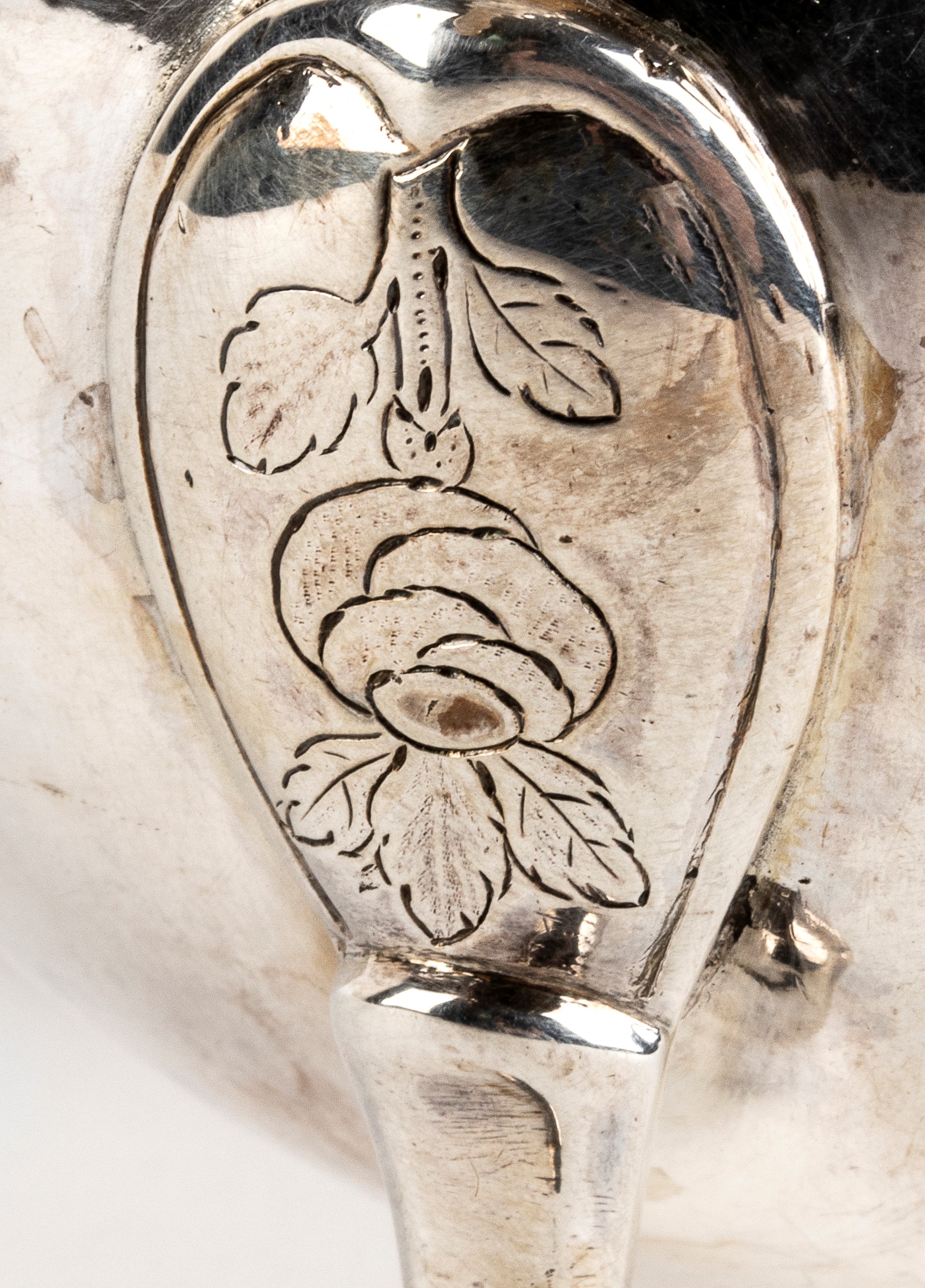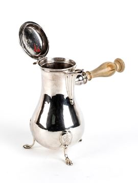 Caffettiera francese in argento, corpo piriforme tipico delle caffettiere della seconda metà del XVIII secolo, poggiante su tre piedi a zoccolo con decoro inciso di ispirazione vegetale, elemento distintivo dello stile Luigi XVI.
