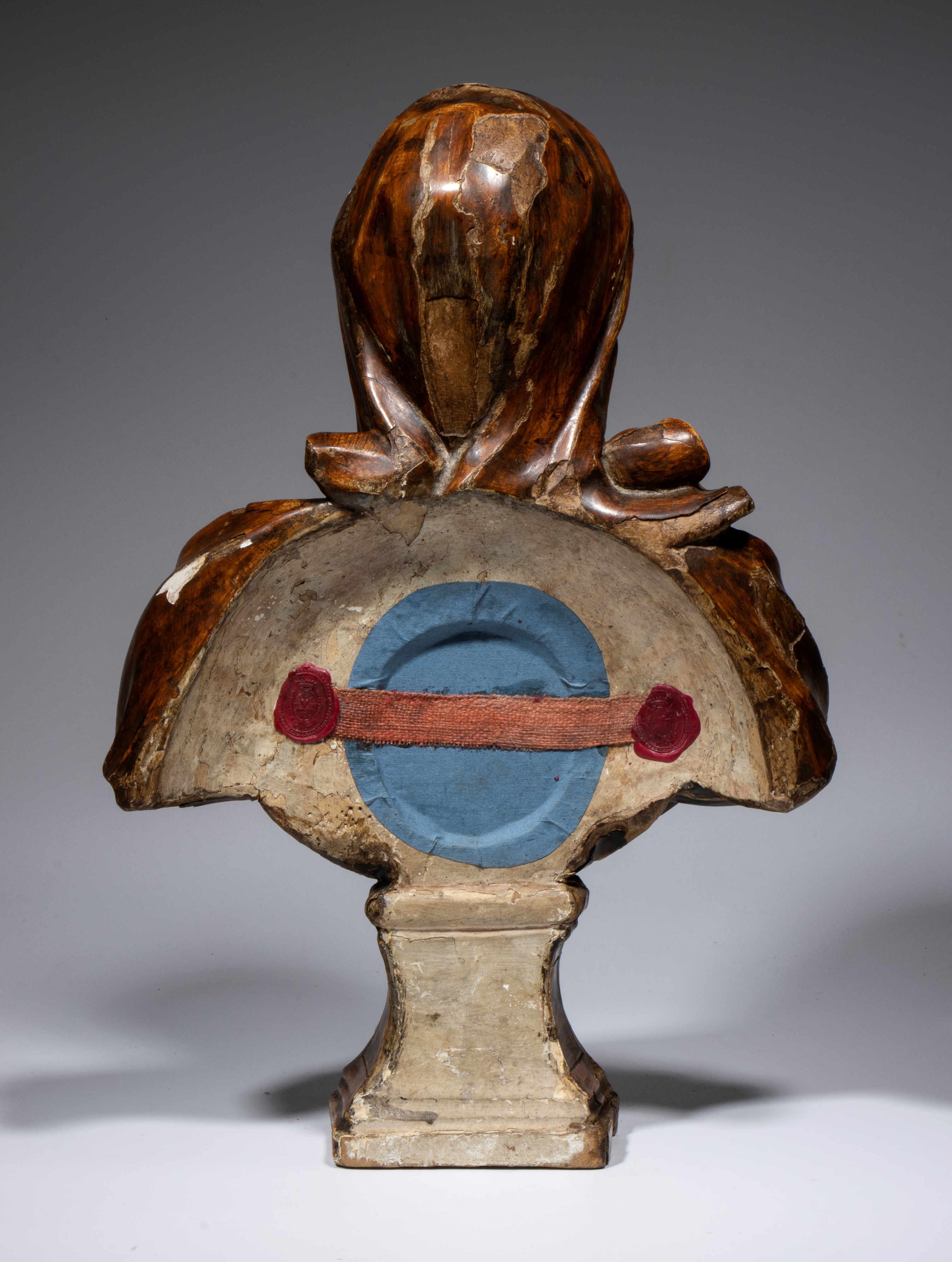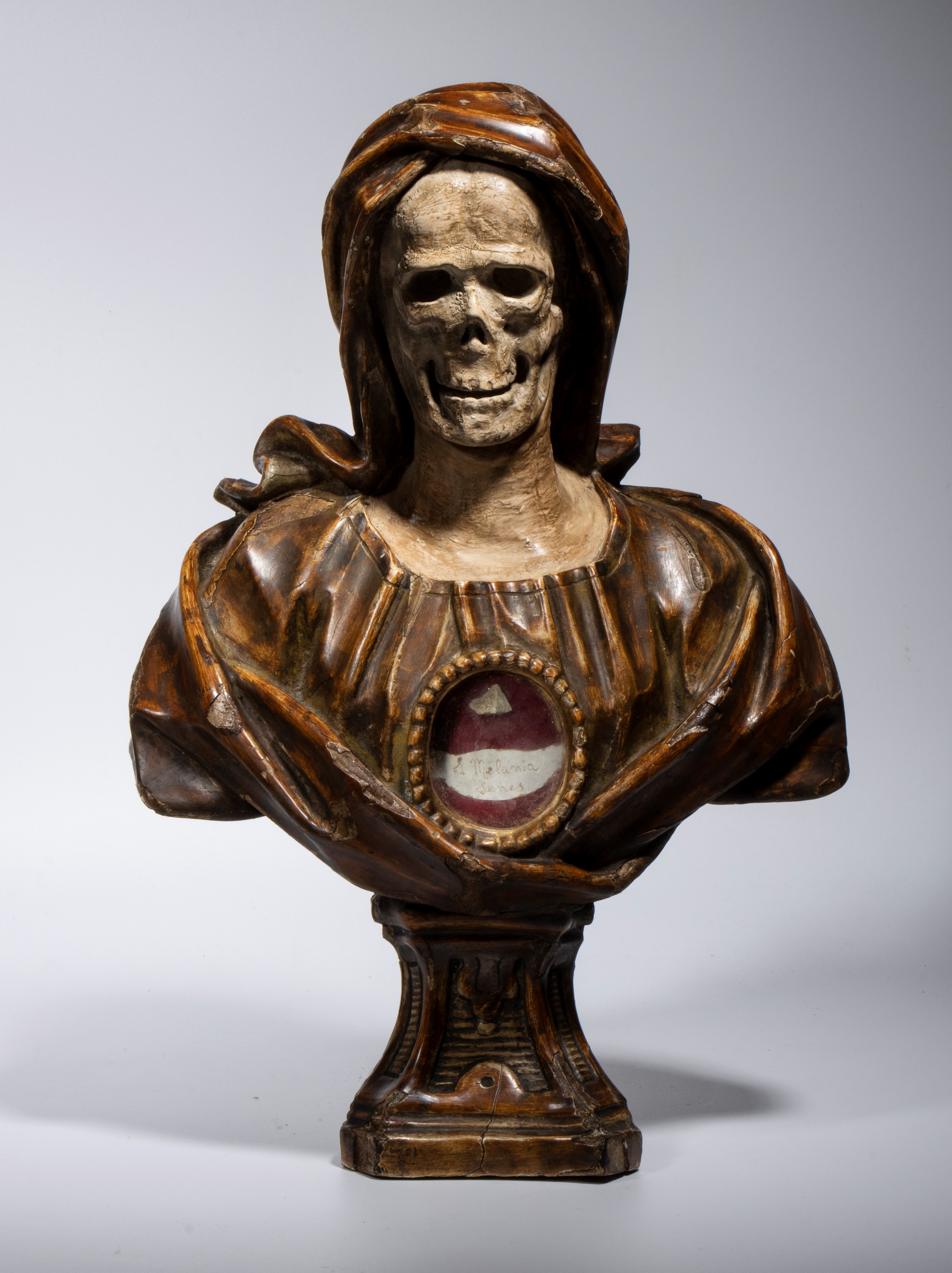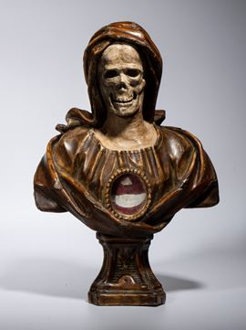 realizzato a tutto tondo, intagliato in legno. Il soggetto è una figura scheletrica, tipica dell'iconografia Memento Mori. Il busto è rivestito da un drappeggio monumentale con pieghe morbide. Al centro del petto è incastonato un medaglione, un ostensorio circolare, protetto da una cornice a perline, sede di una reliquia. L'intera scultura poggia su un piedistallo scolpito con ricche modanature.