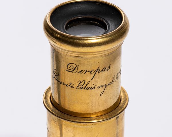 Il cannocchiale da teatro pieghevole, realizzato in ottone con due estensioni scorrevoli e rivestimento in avorio di elefante presenta il fusto firmato dal rinomato ottico parigino Derepas, attivo al Palais Royal n° 23 nella prima metà del XIX secolo.