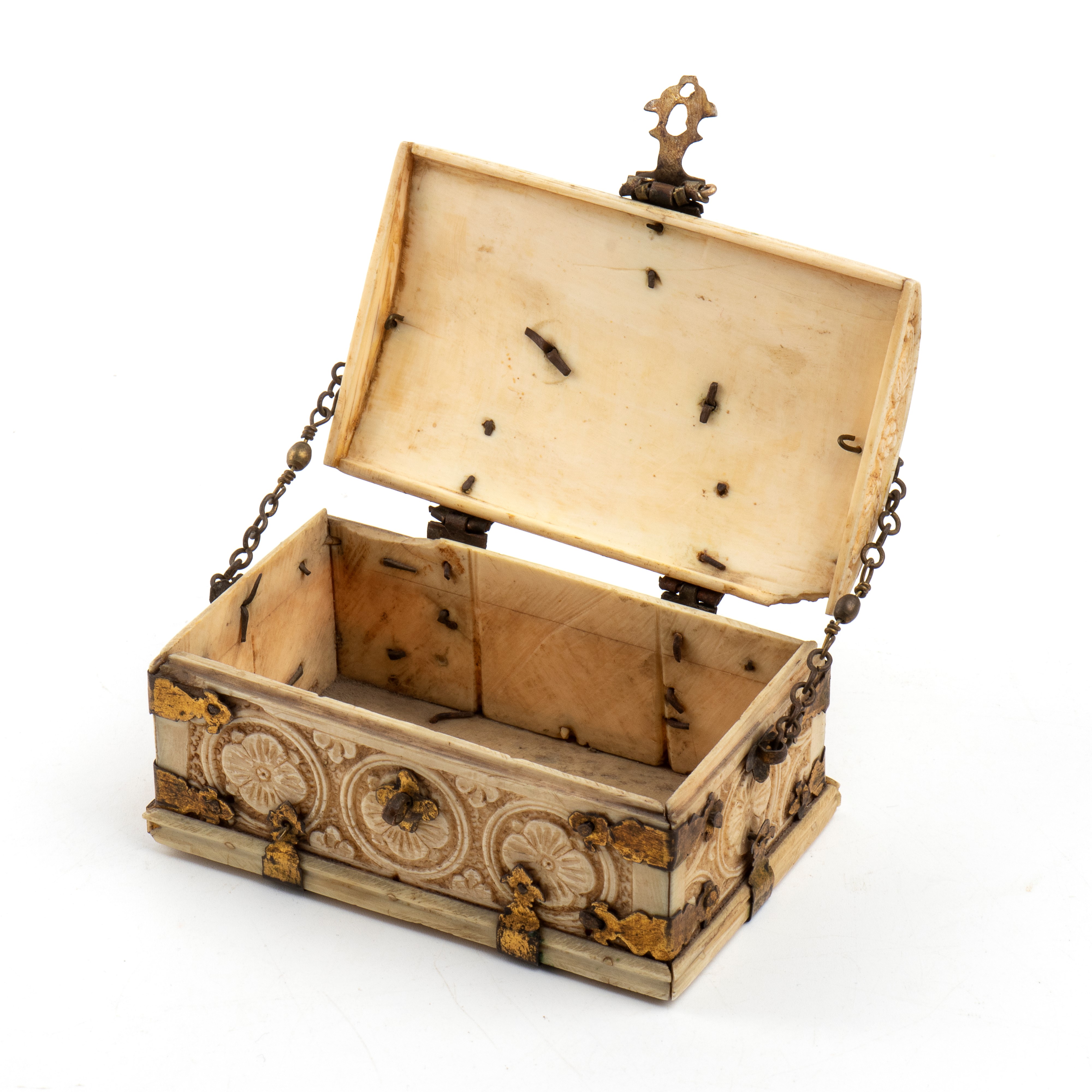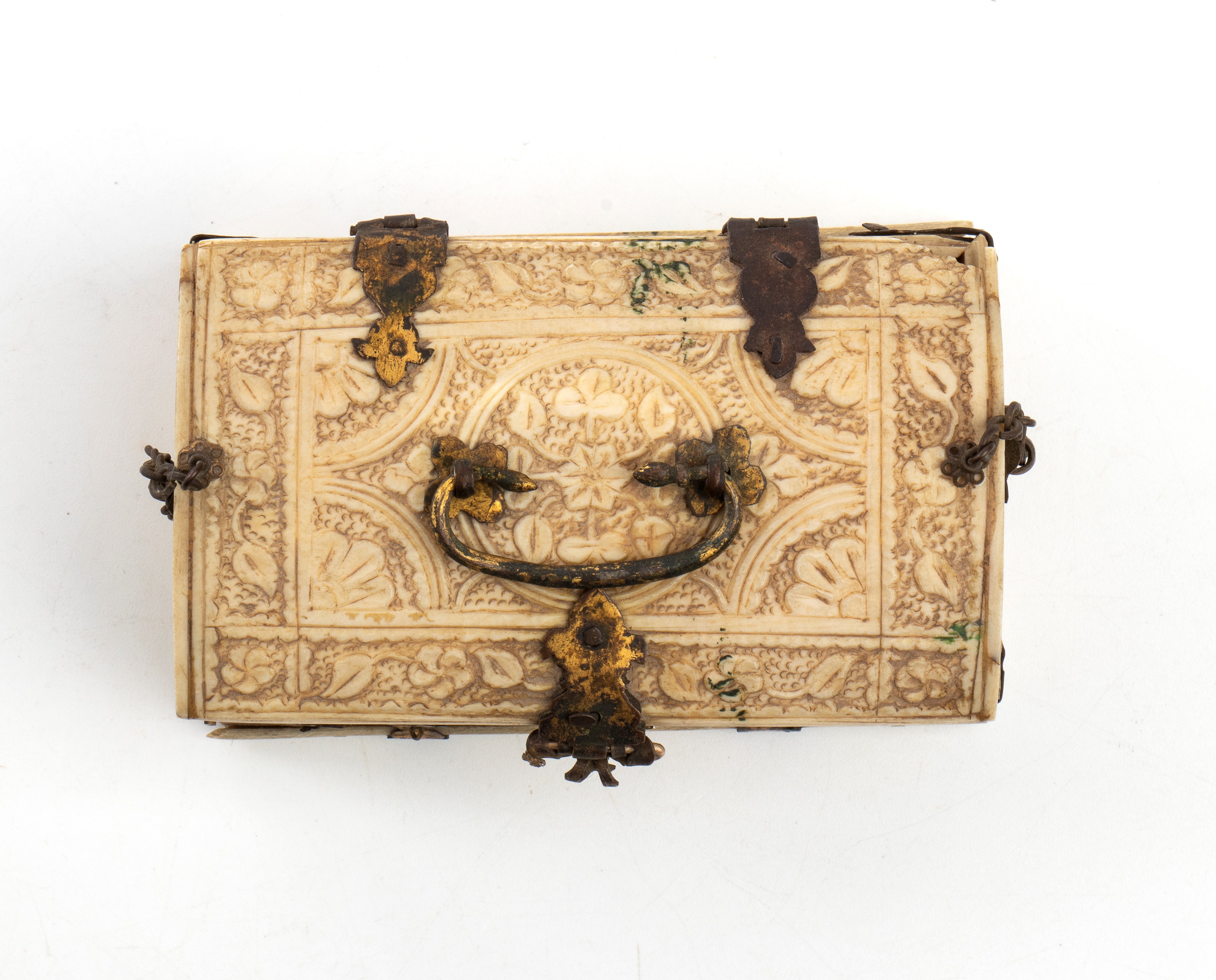 Antico cofanetto in avorio di elefante (Elephas maximus Linnaeus, 1758 or Loxodonta africana Blumenbach, 1797), di forma rettangolare con coperchio incernierato, leggermente bombato. Realizzato con sottili placche in avorio finemente intagliate e assemblate tra di loro, presenta una decorazione su tutta la superficie con motivi a rilievo di gusto floreale e geometrico, disposti entro medaglioni e cornici simmetriche.