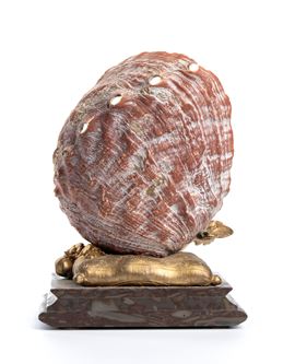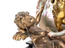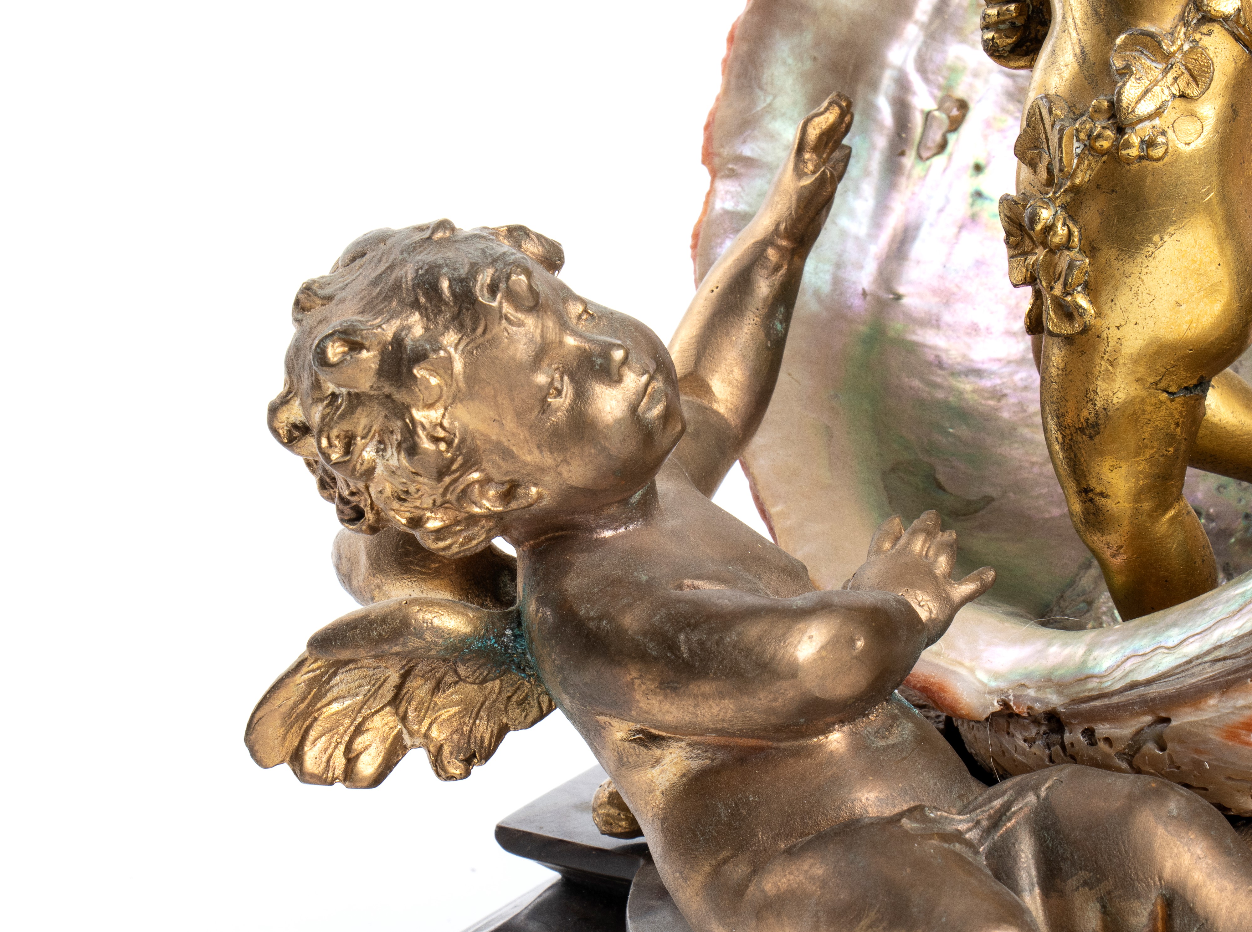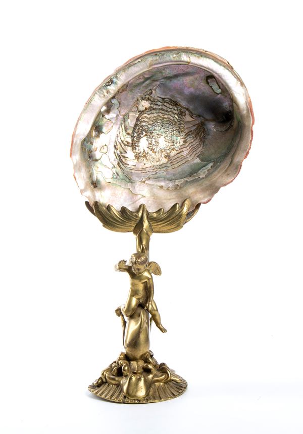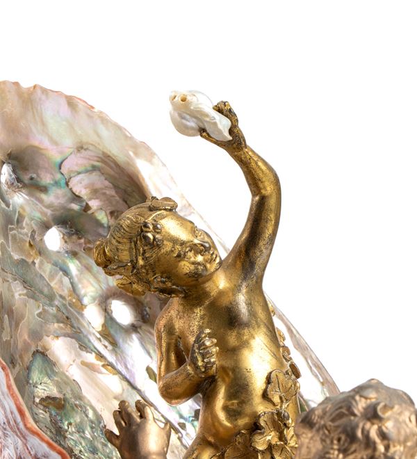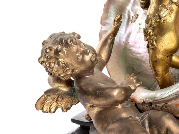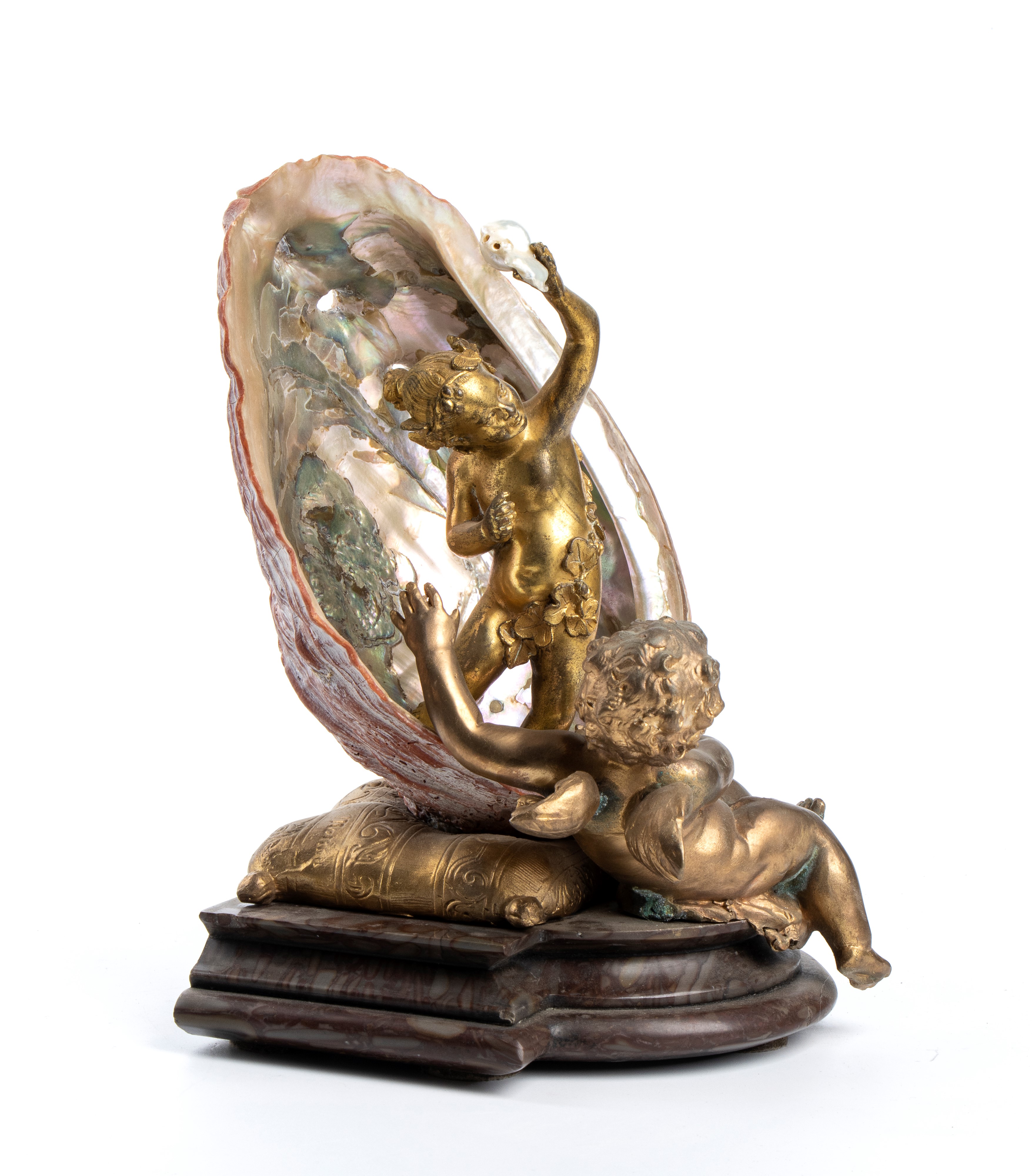 Haliotis Midae, proveniente dal Sudafrica, caratterizzata dalla sua superficie interna madreperlacea, montata su base in marmo. La conchiglia, disposta in posizione verticale, funge da sfondo e cornice naturale alla scena scultorea, creando un suggestivo effetto di profondità e luce. Davanti alla conchiglia si sviluppa una composizione bronzea dorata raffigurante due amorini.