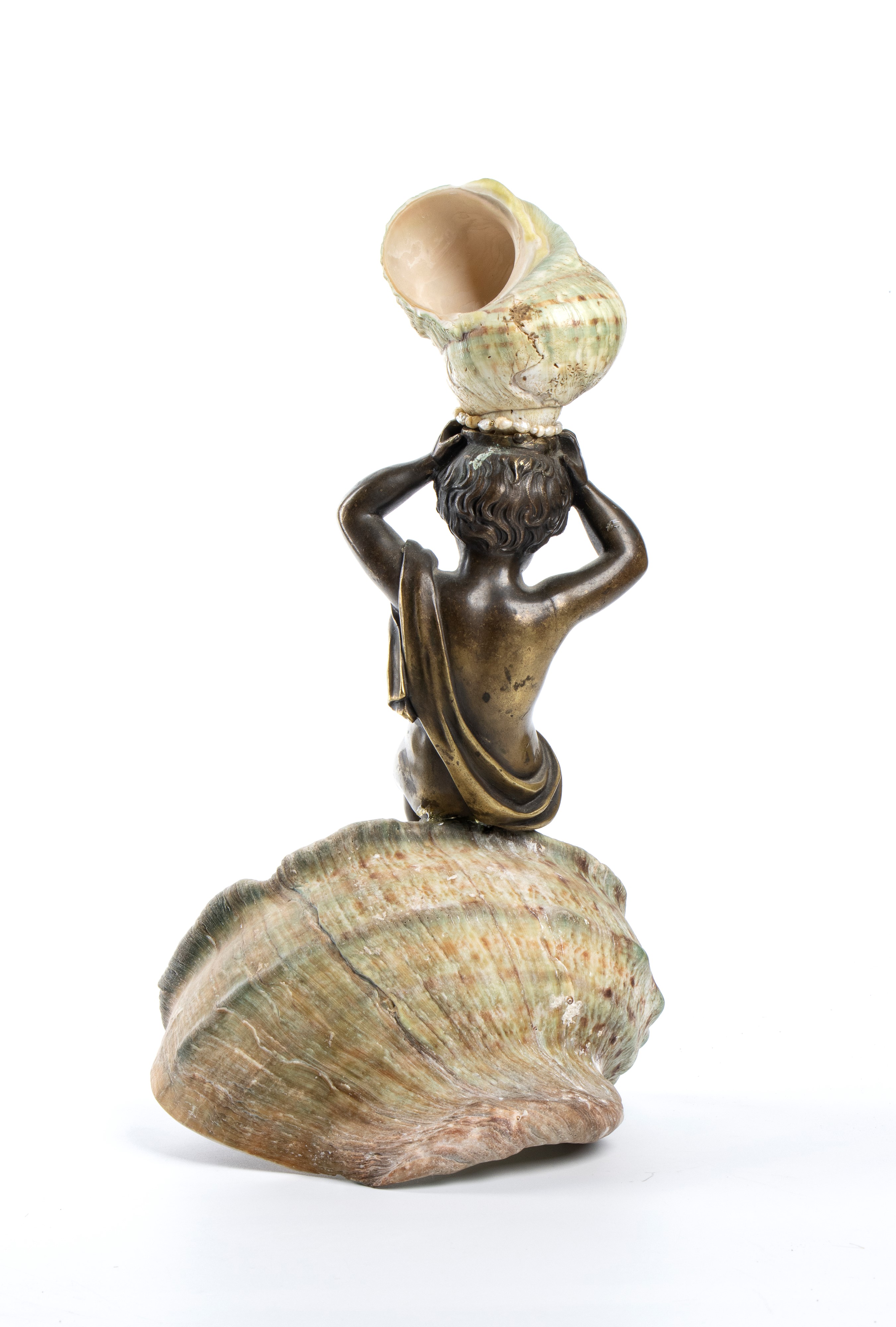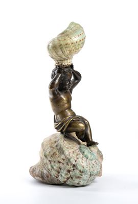 Alla base si trova una conchiglia (Turbo marmoratus) di grandi dimensioni (turboshell), sulla quale è seduto un putto in bronzo finemente modellato.Il putto sostiene sulla testa una conchiglia di dimensioni più ridotte, creando un armonioso gioco di proporzioni e verticalità. All’attaccatura tra la testa del putto e la conchiglia superiore è presente una fila di piccole perle naturali. Esemplare rappresentativo della produzione destinata a collezioni e cabinets of curiosities, in cui la fusione tra elementi naturali e scultura metallica testimonia grande maestria artigianale e gusto decorativo.