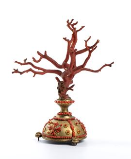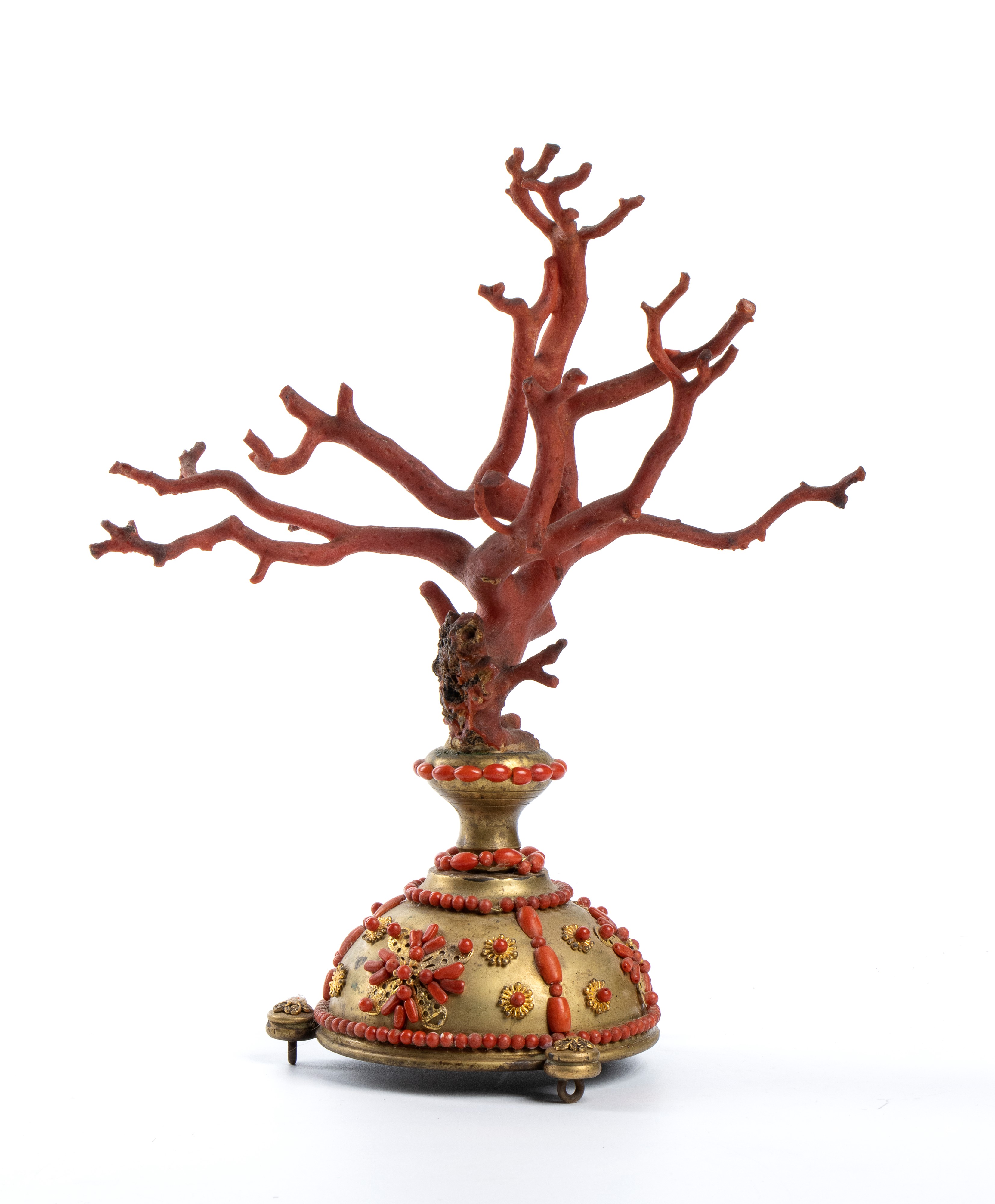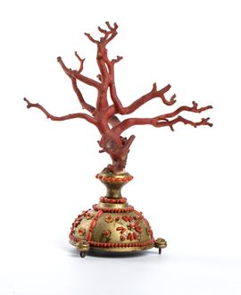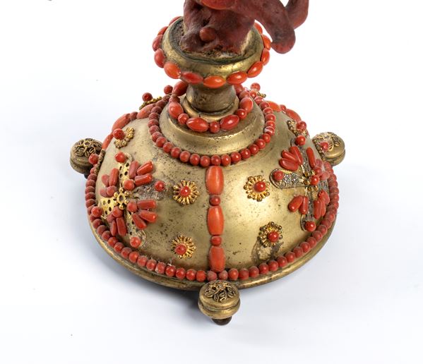 poggiante su una base semisferica in ottone, decorata con inserti di corallo rosso del Mediterraneo disposti a fasce alternate, intervallati da motivi sempre realizzati in corallo che si ripetono lungo tutto il corpo della struttura, creando un ritmo decorativo uniforme e armonioso. La sommità è coronata da un ramo di corallo naturale. Esemplare rappresentativo della tradizione decorativa siciliana, in cui l’abilità artigianale e la ricchezza dei materiali naturali si combinano per creare oggetti di grande eleganza destinati a collezioni e cabinets of curiosities.