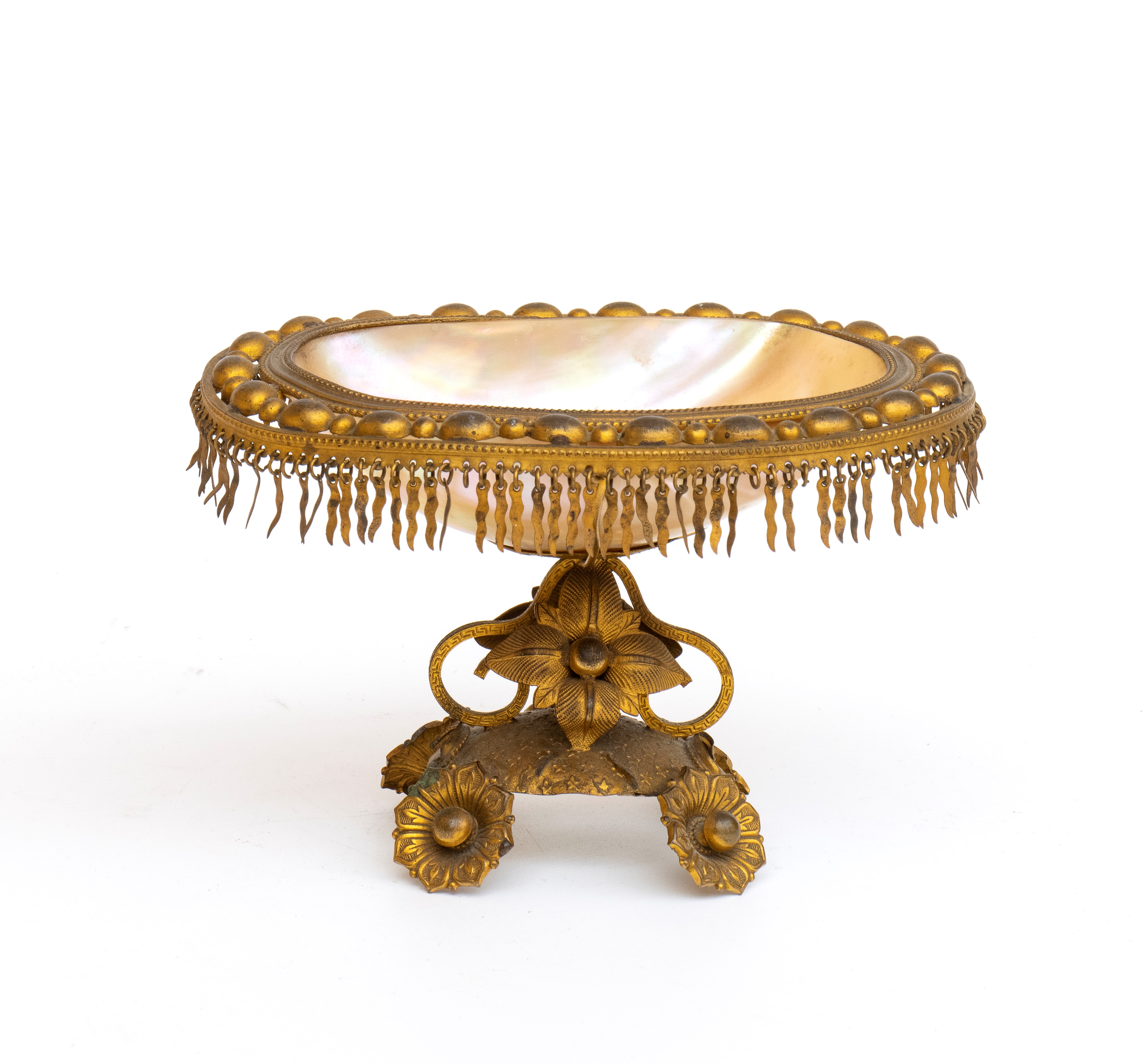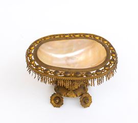 di forma ovale, incastonata in una struttura in metallo dorato. L’insieme poggia su una base a decoro floreale, sostenuta da quattro piedini modellati a forma di fiore.