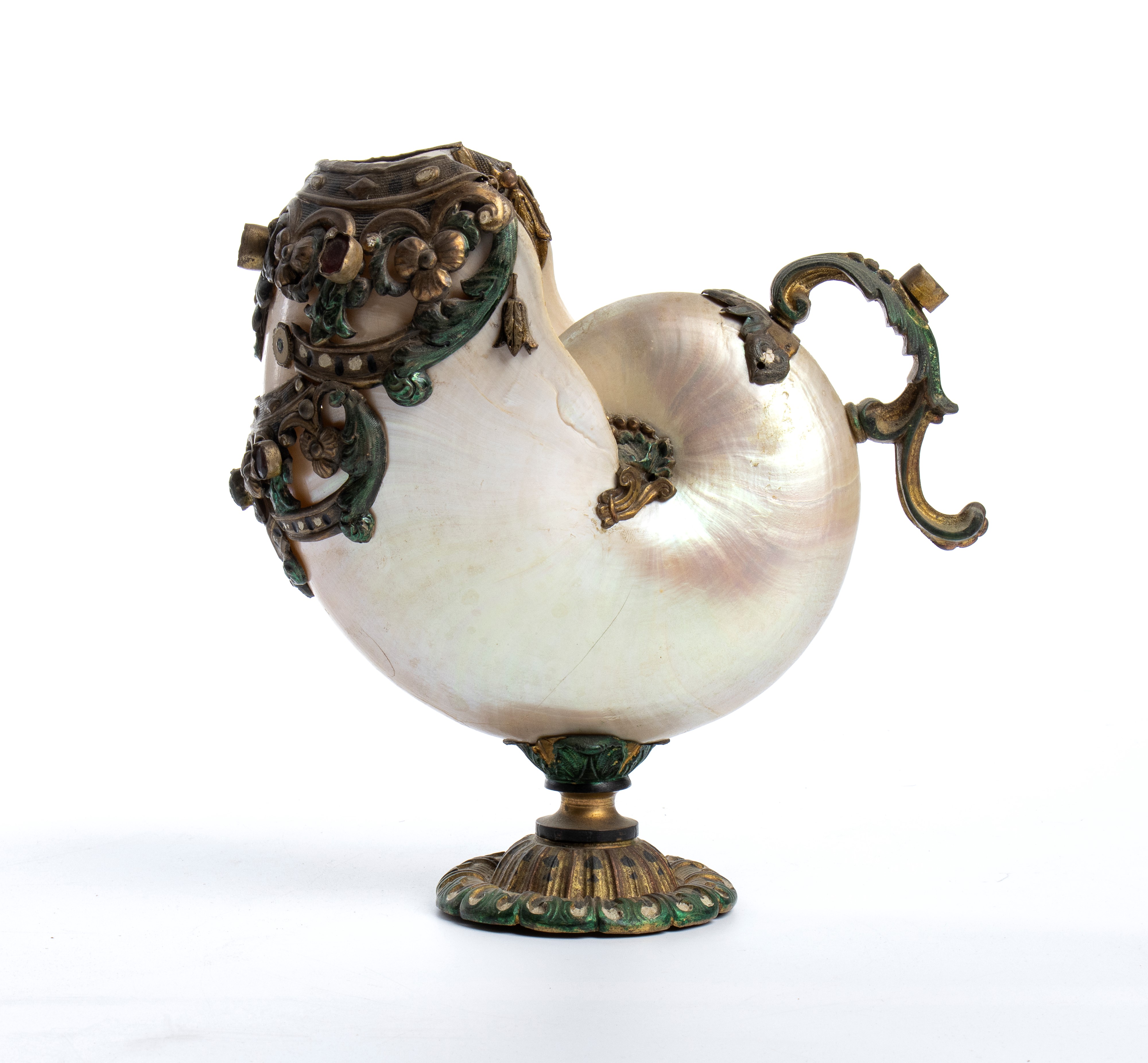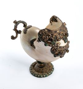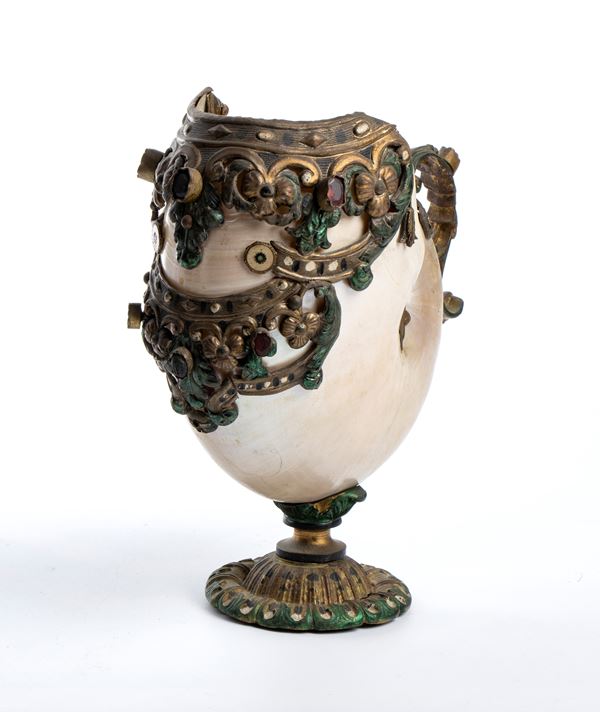 montata su una base circolare modellata in metallo, nella quale la conchiglia è inserita e incastonata. La zona dell’apertura è ornata da una ricca decorazione metallica a motivi a volute e elementi geometrici, arricchita da paste vitree colorate incastonate. Sul lato opposto, un elemento a voluta sagomato funge da manico, conferendo all’insieme l’aspetto di un piccolo contenitore o coppa ornamentale. Sia la base che le montature decorative presentano tracce di pittura verde.