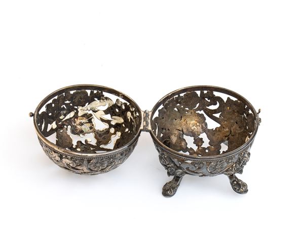 di forma sferica, poggiante su quattro piedini sagomati e dotato di chiusura incernierata. L’intera superficie è traforata e cesellata con ricchi motivi fogliati e floreali.