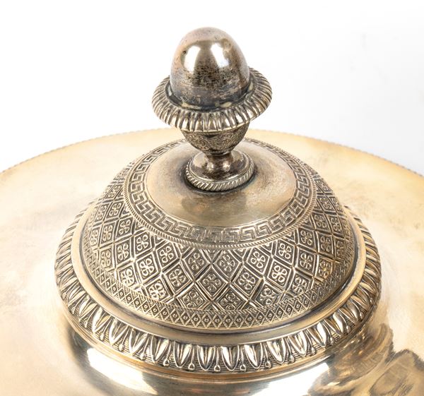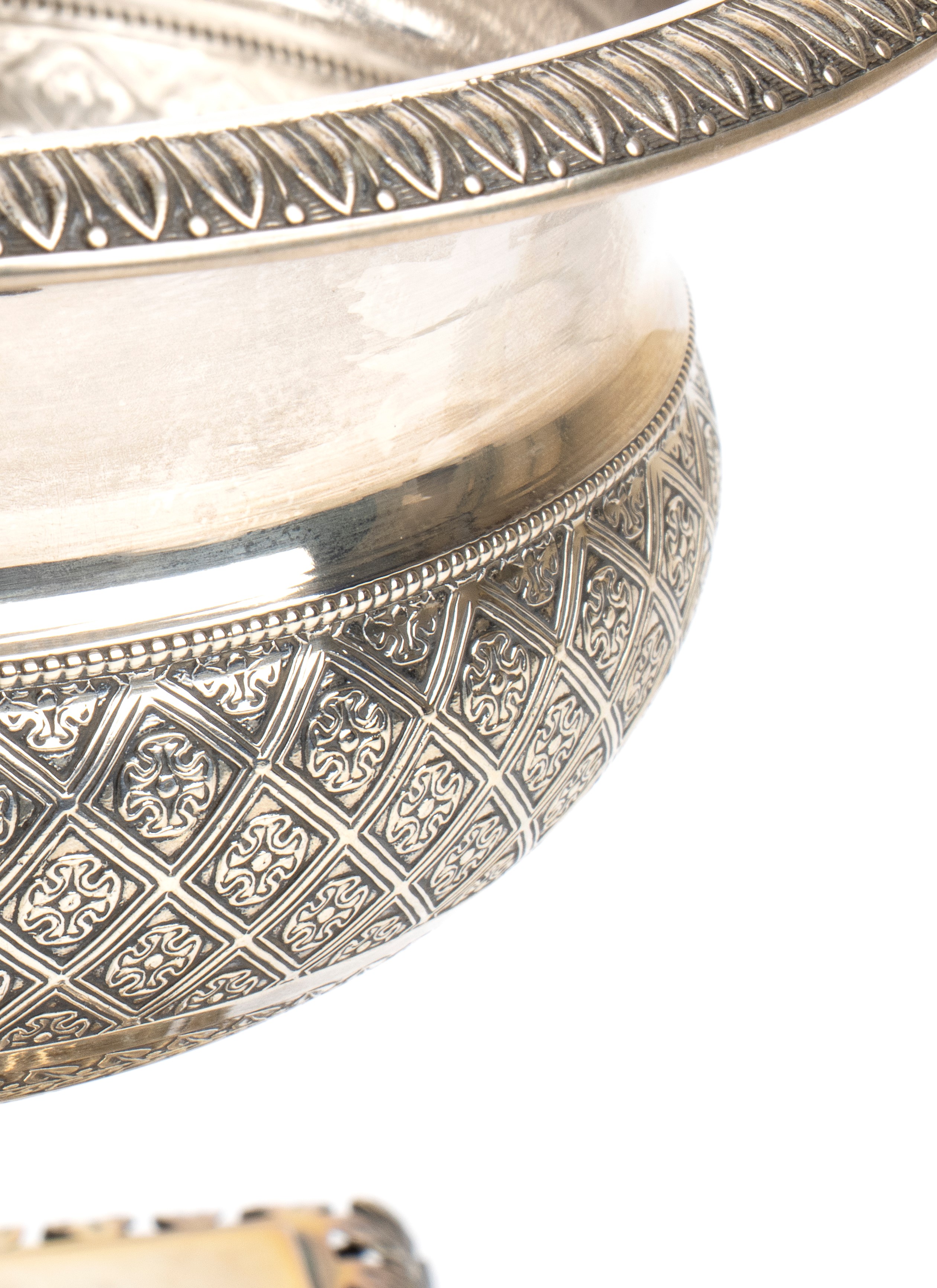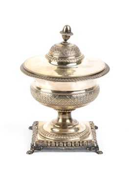 su alto piede quadrangolare. Il corpo della coppa e il coperchio presentano una ricca decorazione a cesellatura minuta con motivi a griglia e fasce lisce. La base è ornata con bordi a rilievo e sorretta da quattro piedini a zampa ferina. Il coperchio a innesto è sormontato da un pinnacolo a pigna.
